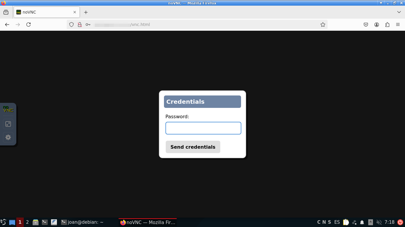 I així ja veurem la pantalla de connexió de noVNC i quan accedim, ja veurem l'escriptori actual: