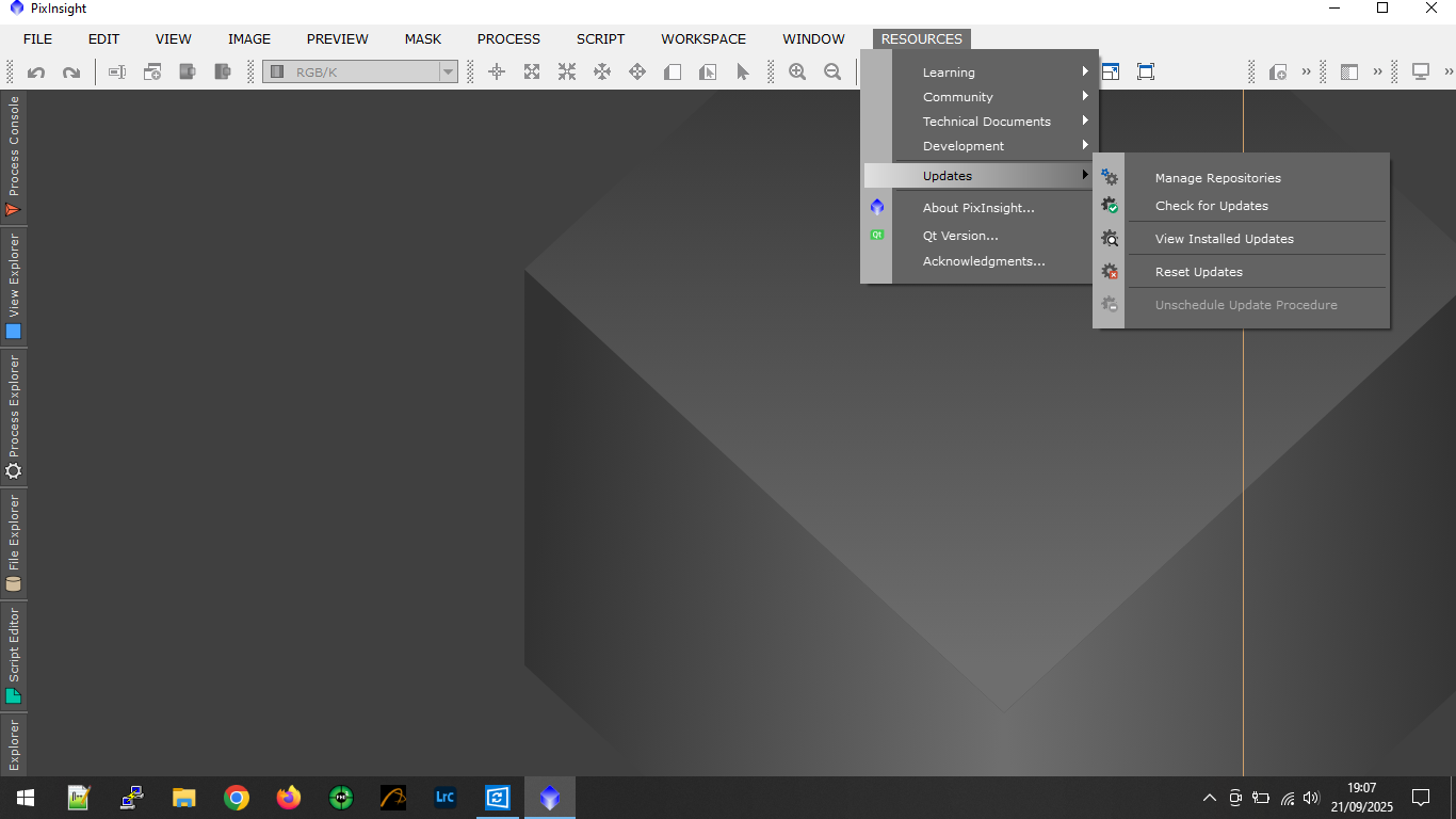 Ara anem al menú RESOURCES > Updates > Check for Updates per a actualitzar els scripts de PixInsight: