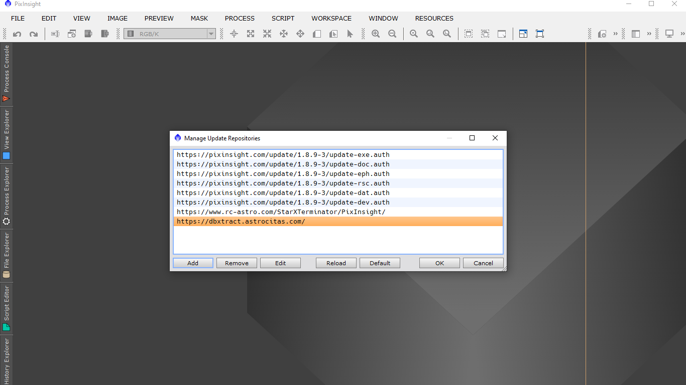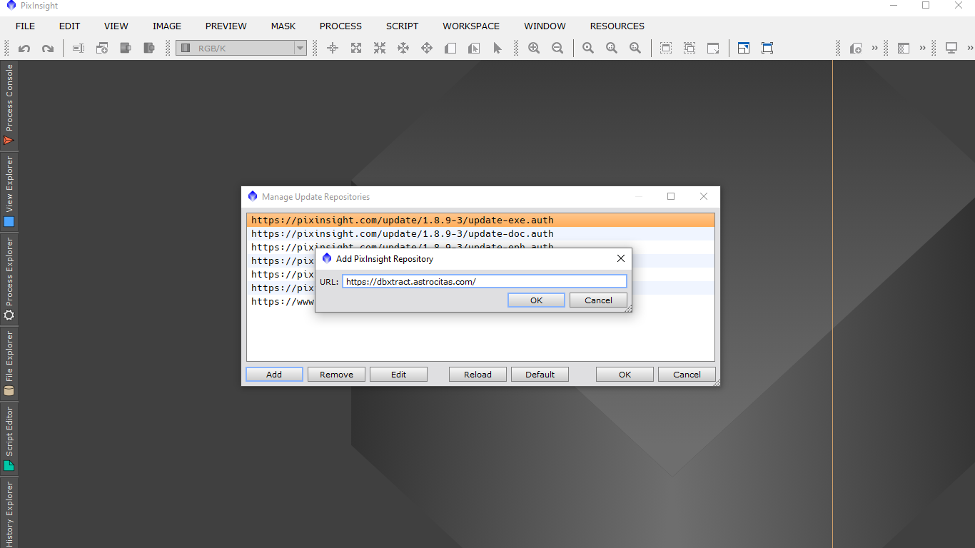 Obrirem el PixInsight i anirem al menú RESOURCES > Updates > Manage Repositories: