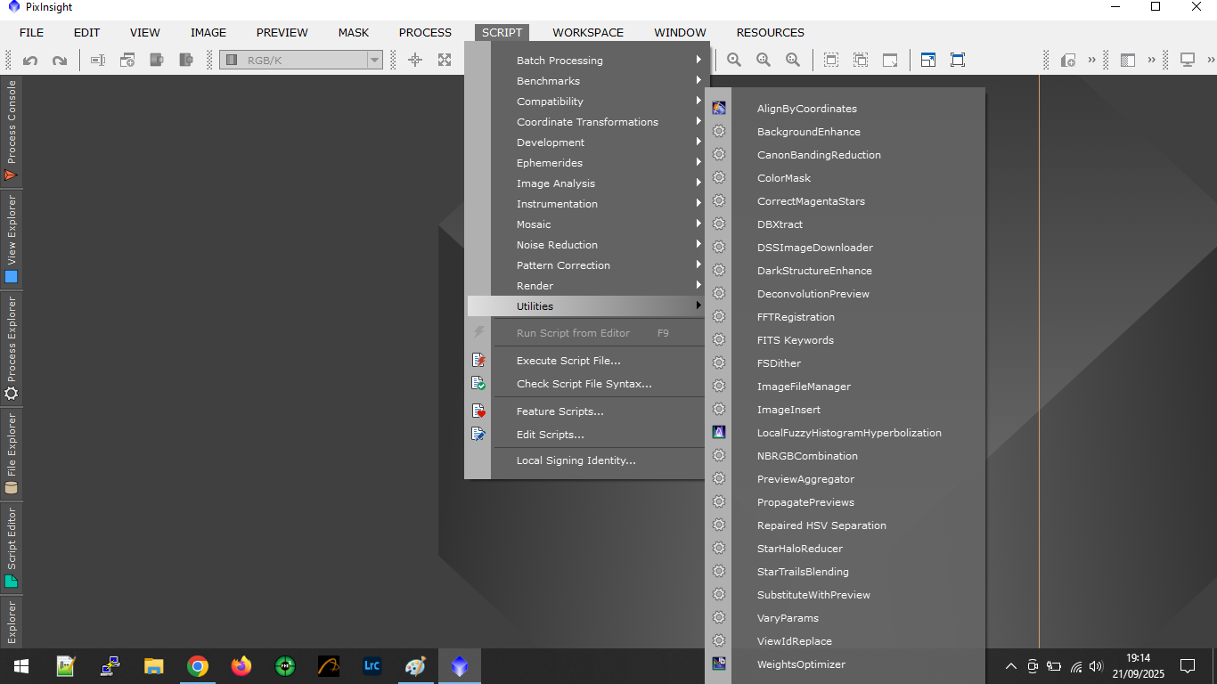 Aquest script ha segut desenvolupat per Raúl Hussein del ITI (Instituto Tecnológico de Informática) i del canal de videopodcasts Astrocitas i m'ho va recomanar Ferran Bosch, soci de la Societat Astronòmica de Castelló, perquè m'aniria bé per als meus processats que vull fer en banda estreta amb filtres multibanda Ha-OIII i SII+OIII i càmera a color.