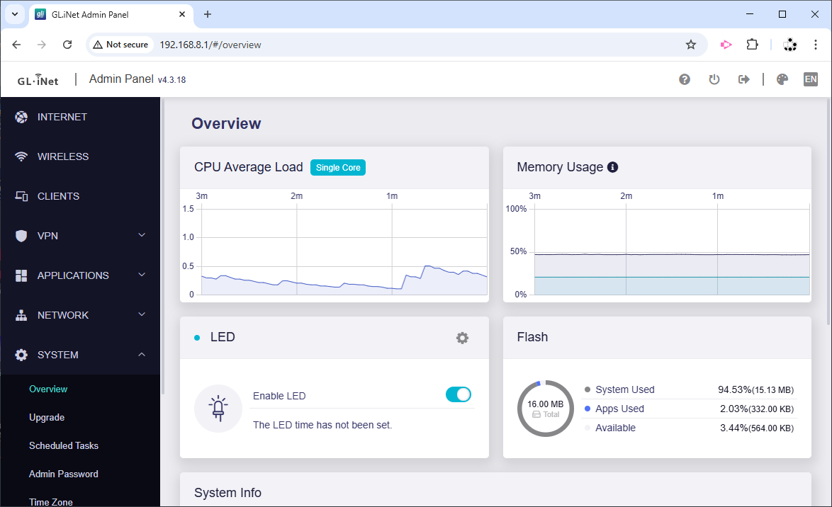La secció SYSTEM > Overview m'ha agradat, pots veure el consum de dades en temps real i altres estadístiques interesants: