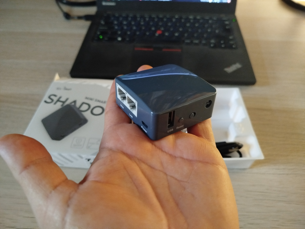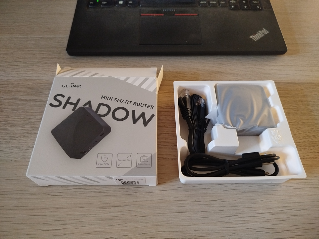 Ací tens una apertura de caixa d'aquest mini router SHADOW GL .iNet GL-AR300M16. La primera cosa que sorprén és lo xicotet que és i el poc pes, és molt lleuger: