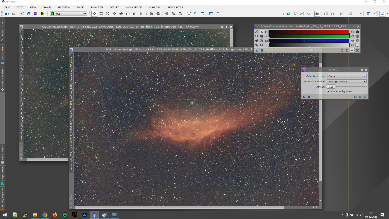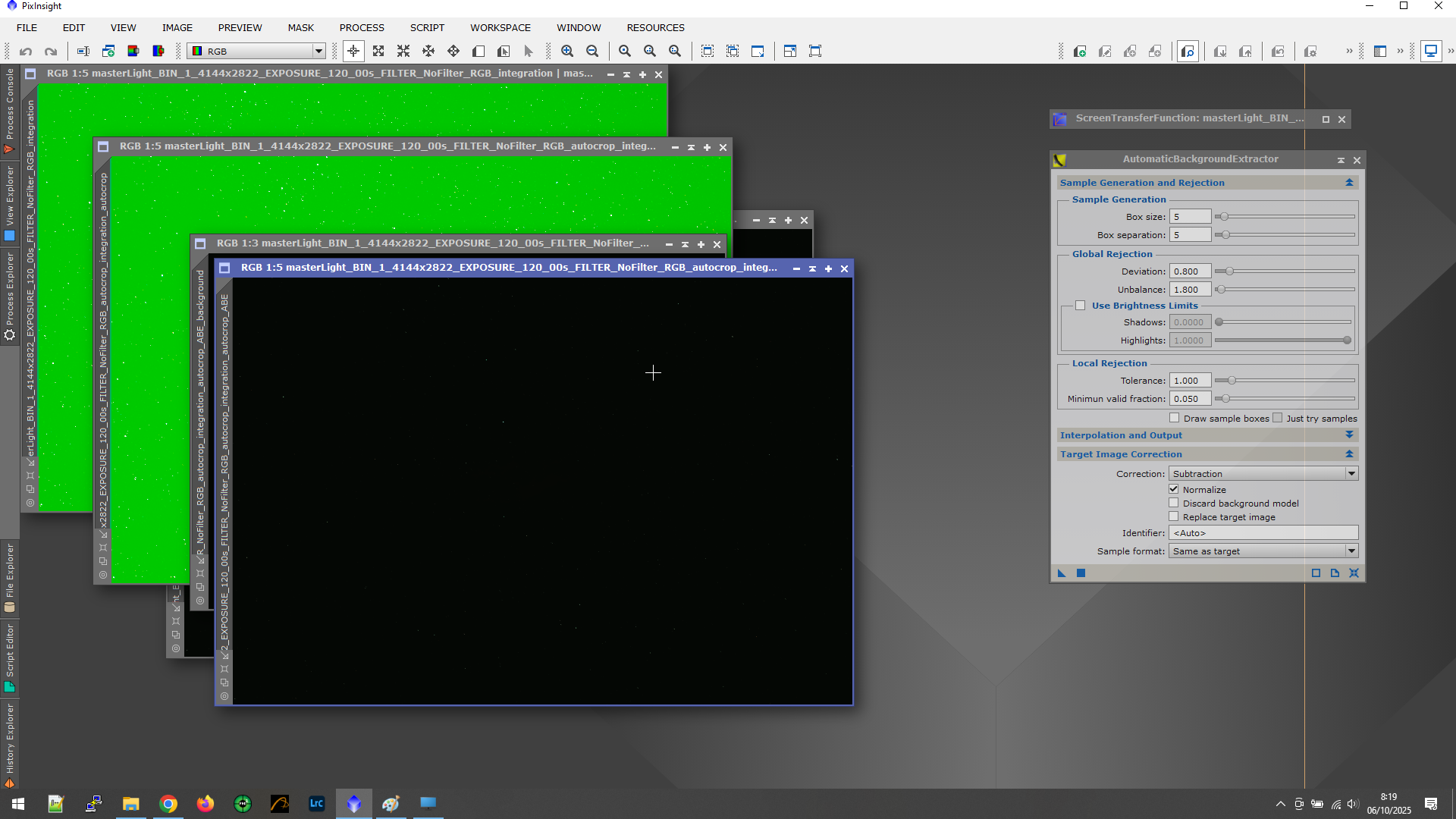 Eixa tonalitat verda és normal per la resposta del sensor, ja que a les càmeres astronòmiques sovint hi ha el doble de píxels verds en el sensor que rojos o blaus. També és per què per defecte no tenim encara el fons de cel no neutralitzat. Per a corregir el color del fons i esborrar la tonalitat verda, he passat el ABE (Automatic Background Extractor) configurant-lo com a 'substraction':