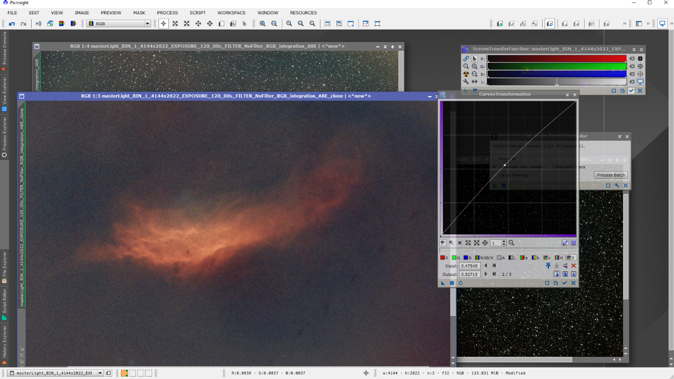 En aquest punt, quan només tenim la nebulositat, podem donar-li protagonisme a alguna regió o tonalitat de la nebulosa sense perjudicar el fons ni les estreles. Jo he pujat subtilment la saturació amb CurvesTransformation tal i com veus a la següent captura de pantalla: