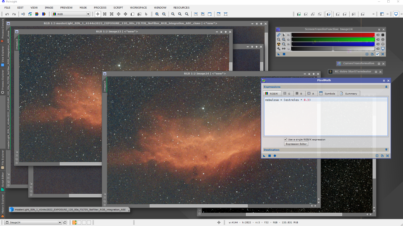I ara torne a recuperar les estreles fàcilment des de la ferramenta PixelMath. Jo ho faig tal com veus a la imatge potser no és la millor manera, perquè aquesta ferramenta és tot lo complexa que vullgues, però bàsicament ajunte les dues capes però aplicant una reducció en la capa de les estreles per a donar-li més protagonisme a les nebulositats de NGC1399: