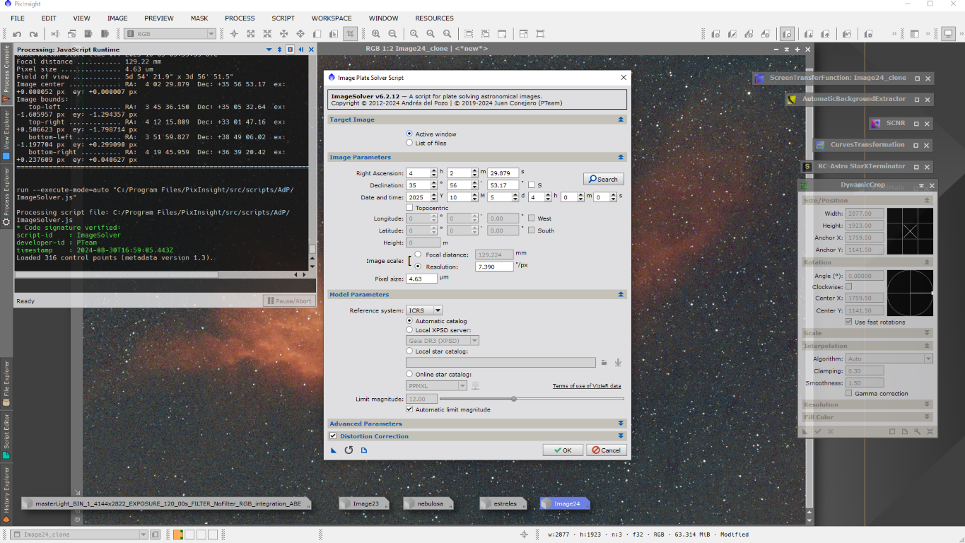 Ara a mi m'agrada sempre fer resolució de plaques amb PixInsight per a poder reconéixer la zona on estic i veure si hi ha alguns objectes interessants a la imatge. Per a fer la resolució de plaques, obrirem l'script ImagePlateSolver i li configurarem el nom de l'objecte o estrela principal de la imatge, l'any, mes i dia, la resolució de la nostra càmera i la mida del píxel: