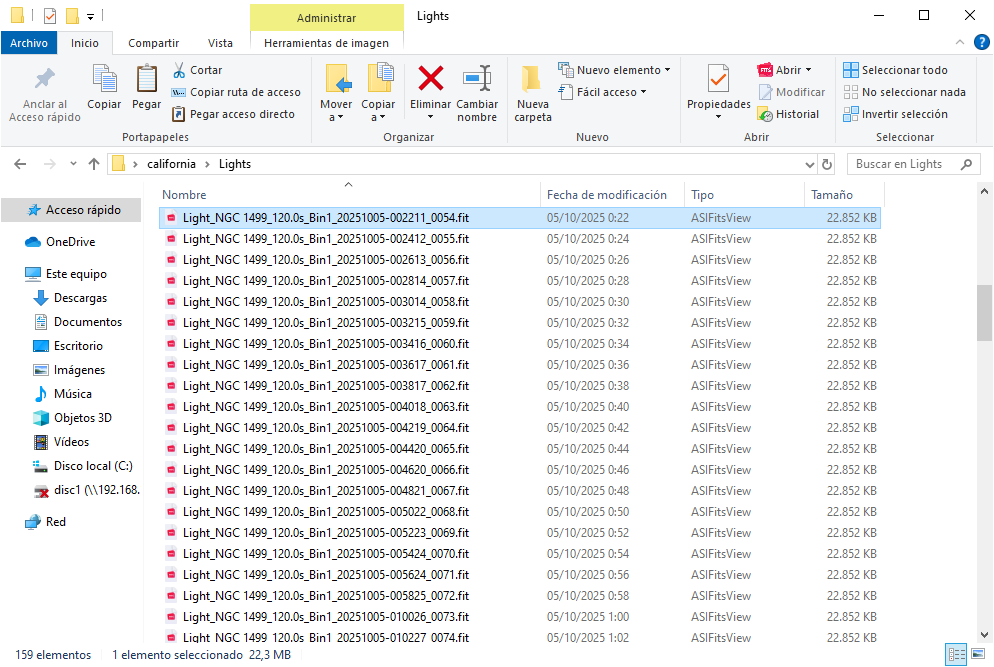 El dissabte passat, 3 d'octubre, hi havia una nit estable i sense núvols. Vaig aprofitar al meu terrat per a muntar dos equips i capturar llums tota la nit. Les captures que vaig fer a NGC1499 van ser amb la montura Orion Sirius, l'objectiu fotogràfic Samyang 135mm F2.8 i la càmera ASI294MC Pro amb un filtre multibanda estreta Askar Magick Colour Ha + OIII. Ací pots veure un vídeo que vaig fer del començament de la nit quan apuntava als objectes que volia.