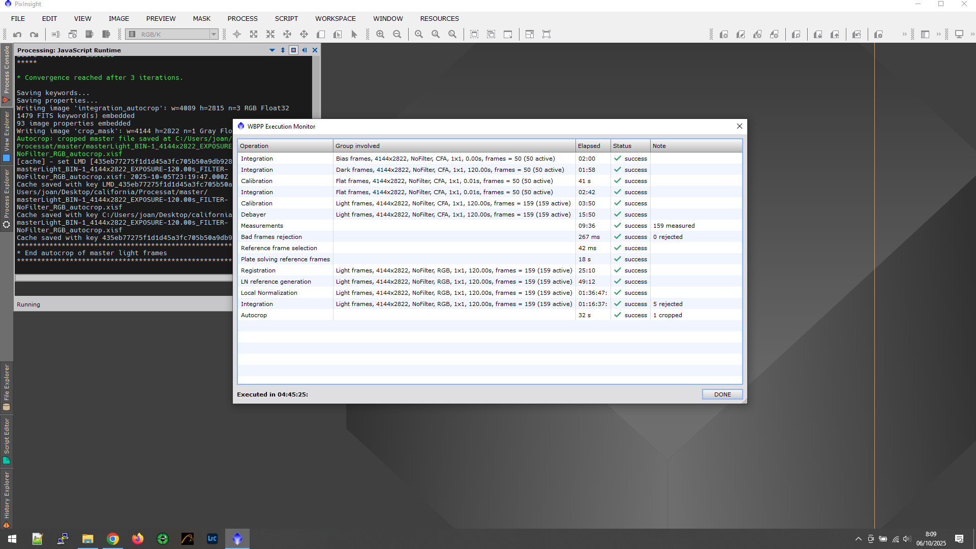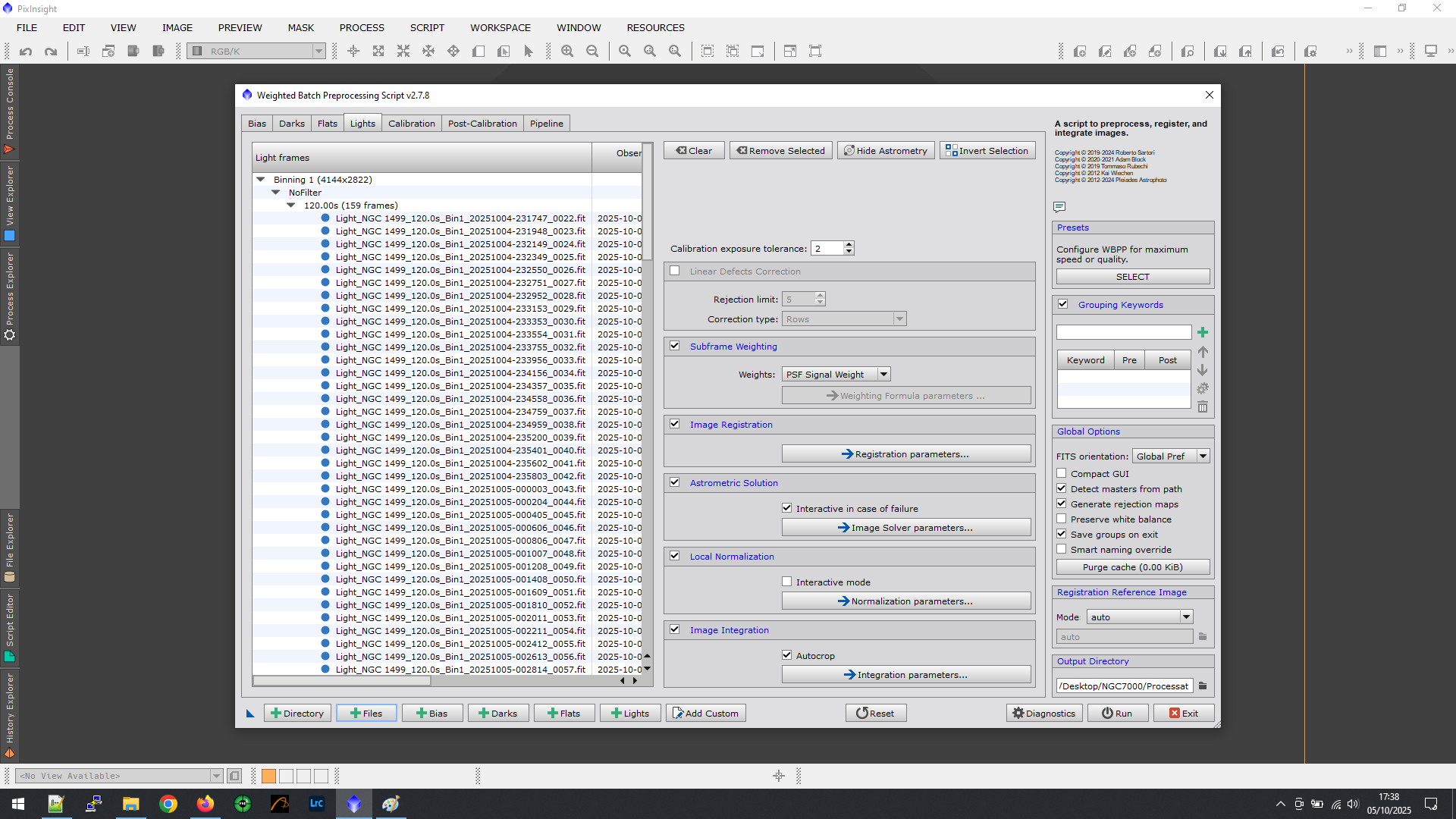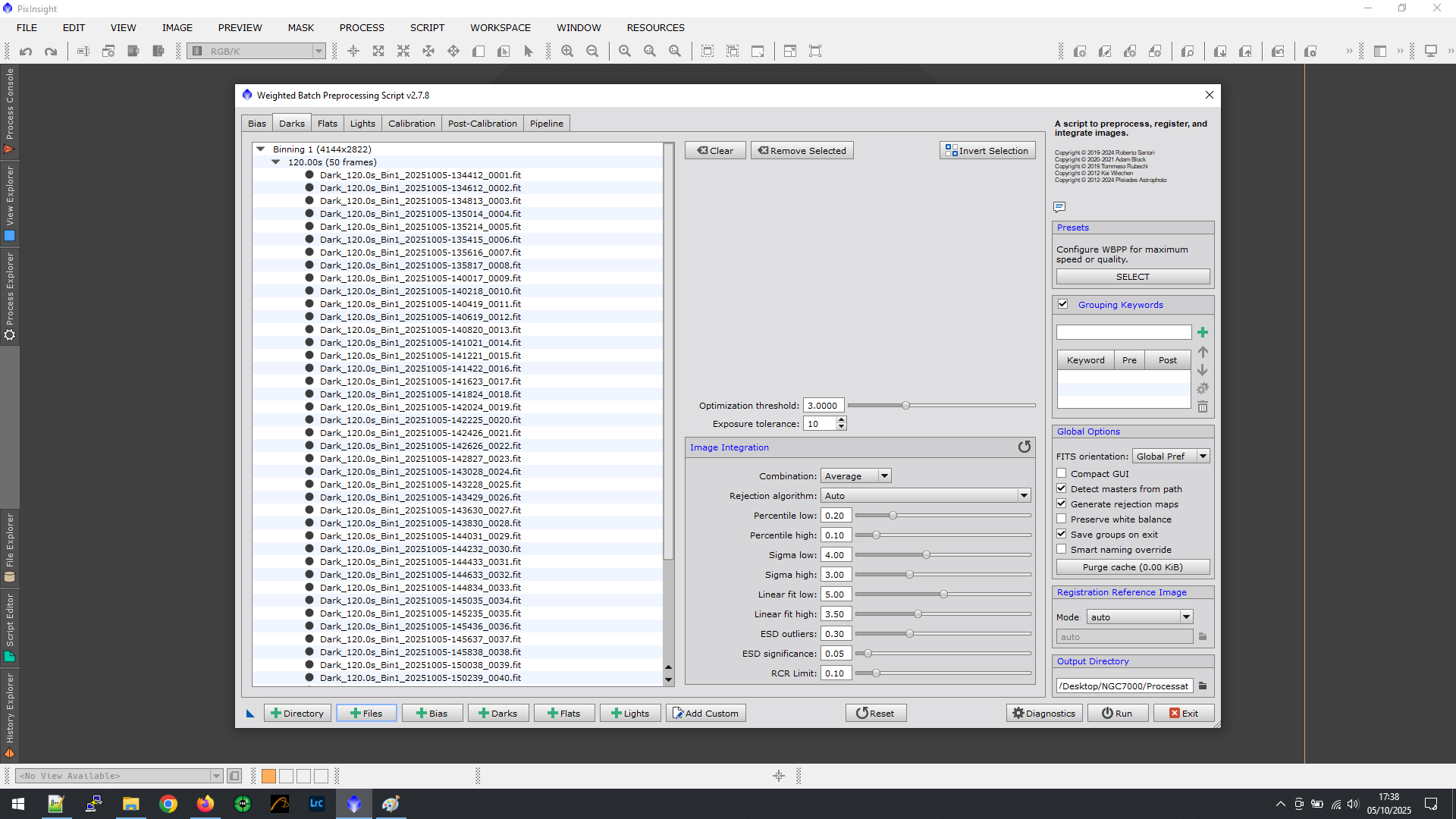 I últimament estic alineant, apilant i calibrant amb PixInsight, aleshores vaig obrir WBPP (Weighted Batch Preprocessing Script ) i vaig començar a configurar les tomes de calibració i Lights. No vaig fer Bias perquè segons he llegit a diversos fòrums, la meua càmera ASI294MC Pro no fa bé els Flats ràpids i recomanen fer Flats d'aproximadament 2 a 5 segons i també no fer Bias sinó Dark-Flats amb la mateixa temperatura i temps d'exposició que els Flats: