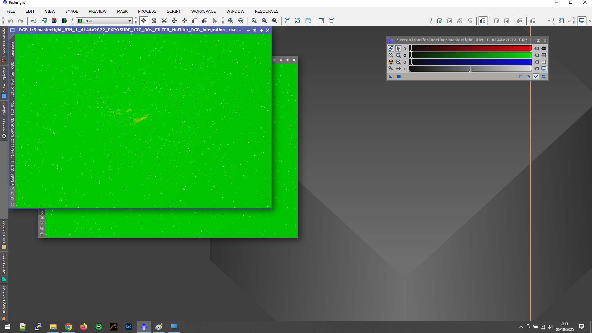 Una vegada finalitzat el treball que fa WBPP, he obert els master Light. Veuràs un fons verd, però això és normal ara en aquest punt del procès. Un master Light és el normal, i l'altre és un master Light amb "autocrop", és a dir, que PixInsight ha retallat els bordes de la imatge quan ha considerat que falta llum o no està ben alineada la imatge i té algun defecte o falta d'informació: