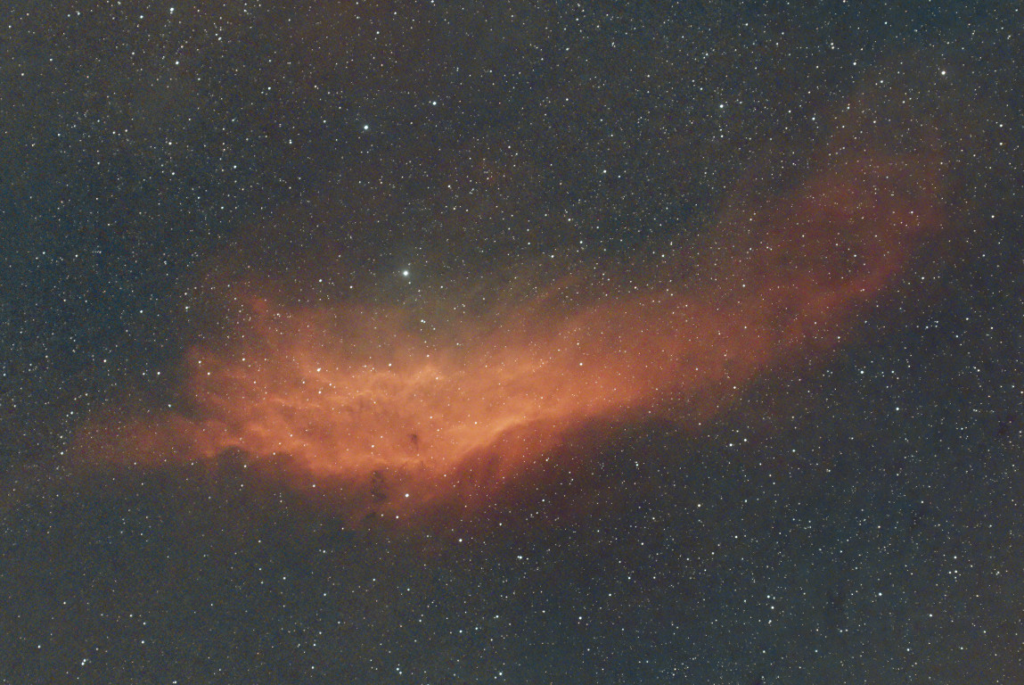 I bé, ací tens el resultat del processament d'NGC1499, la nebulosa Califòrnia, apilant 159 Lights + 50 Darks a un cel Bortle 8 i una nit amb Lluna al 90%: