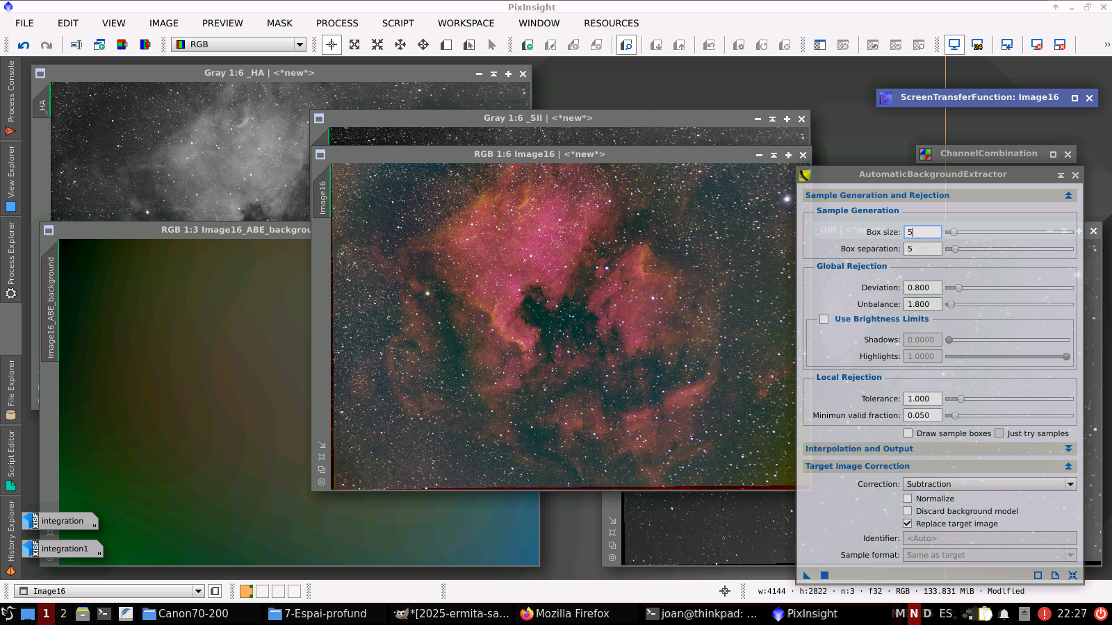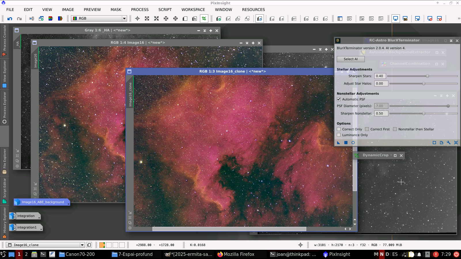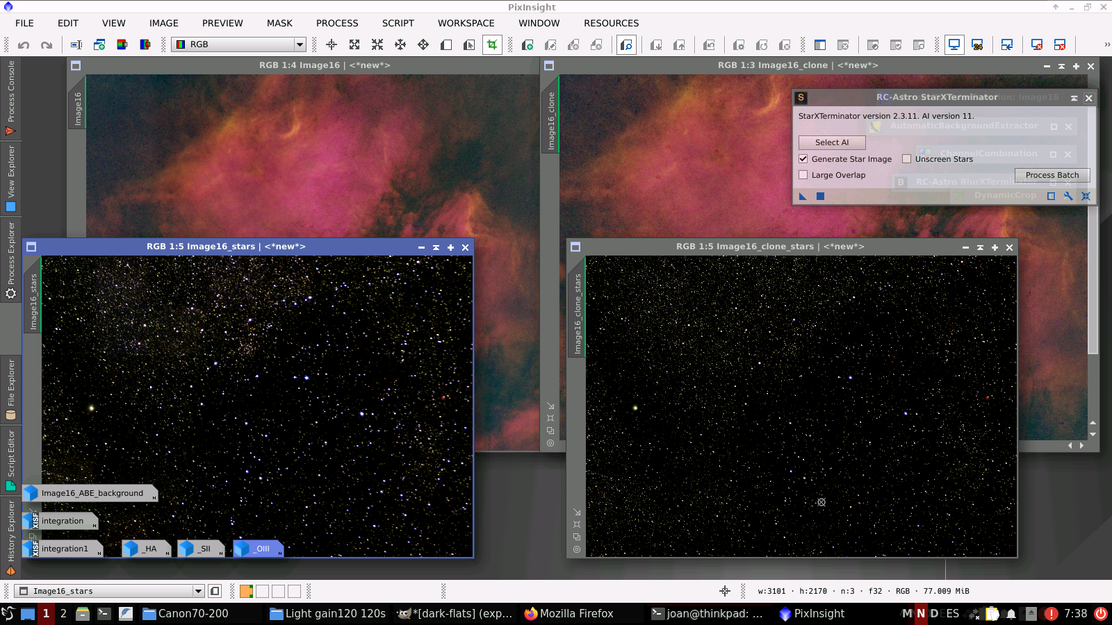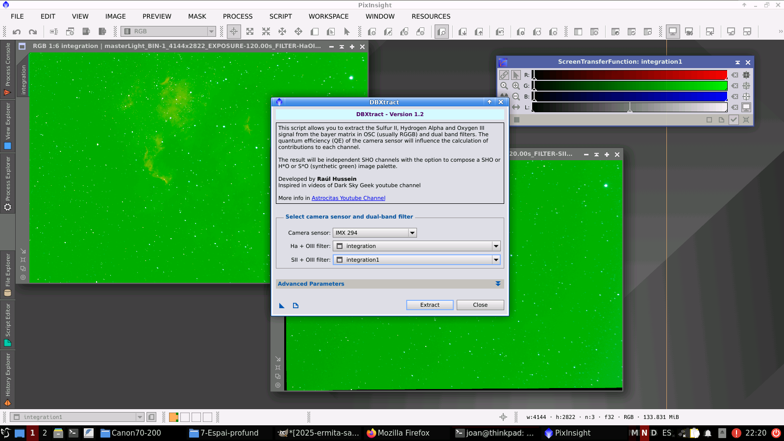 Aquesta vegada el repte era triple, volia provar un nou objectiu fotogràfic, el Canon 70-200 F/2.8, del qual m'han parlat molt bé dos companys de la Societat Astronòmica de Castelló, Luis Robledo i Ferran Bosch, vaig improvissar-me un dock per a fer-ho servir. El segon punt era processar nebuloses d'emissió (NGC7000 Nord Amèrica i IC 5067 el Pelicà) baix el cel Bortle7 que tinc a ma casa, però ara practicaria amb una càmera a color i dos filtres Askar Magic Colour dualband, el Ha/OIII i el SII/OIII, i en comptes d'extraure els colors R + G + B dels Lights, i asignar un color a Ha, a OIII i a SII, aquesta vegada volia practicar amb l'script DBXtract, desenvolupat per Raul Hussein, un astrònom valencià molt actiu en AVA i en el seu projecte Astrocitas. L'script DBXtract ens permet processar imatges de banda estreta capturades amb filtres dualband molt fàcilment i en questió de segons extreu els diferents Lights de manera molt bona i consistent.