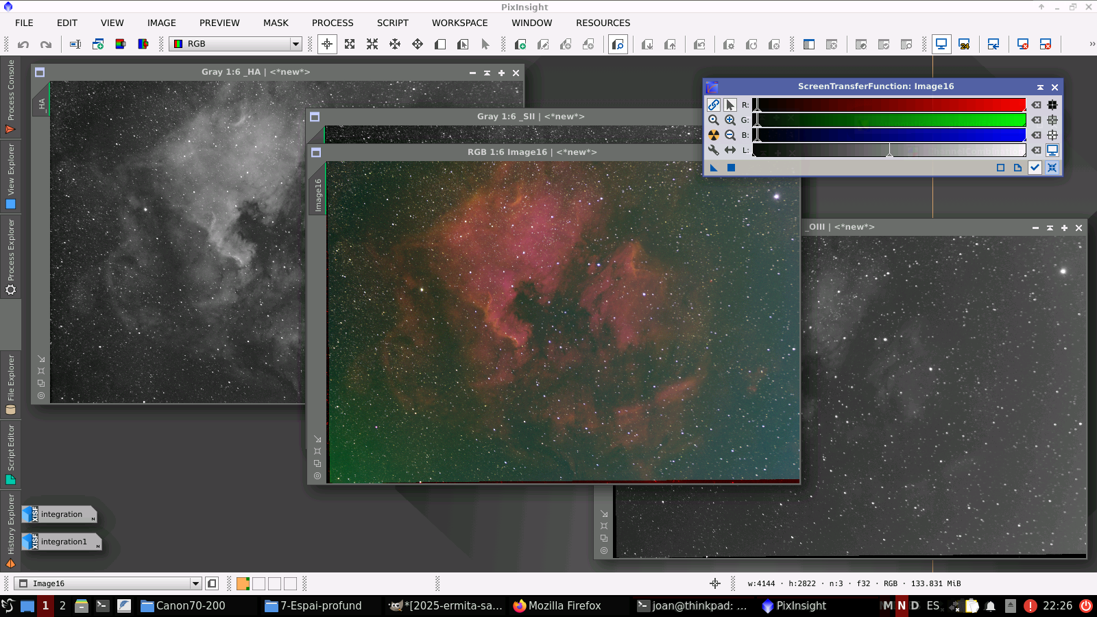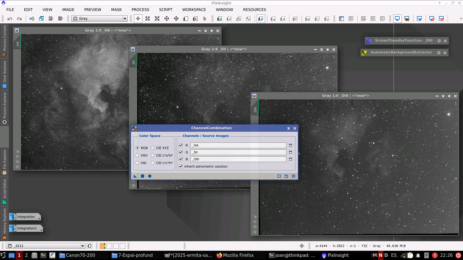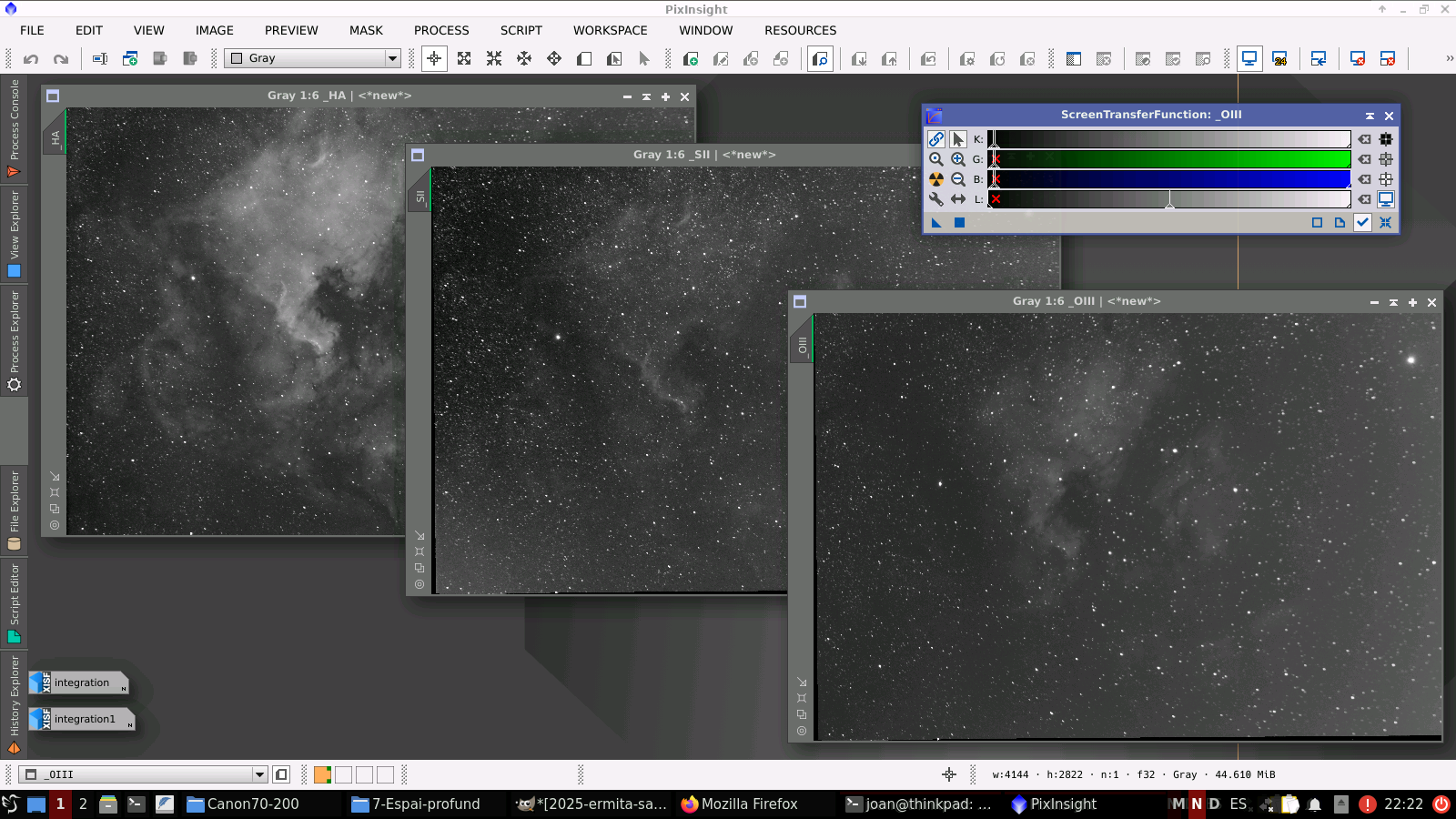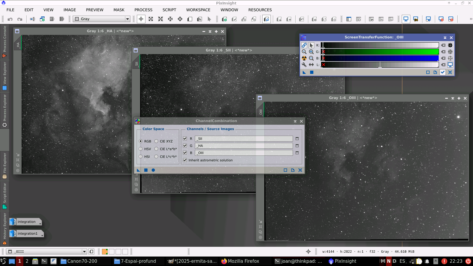 I ací el resultat, impecable, espectacularment bo. Tenim, per ordre, el Light de Ha, el Light de SII i el Light de OIII, amb molts detalls. Estic maravellat, per cert, amb la càmera ASI294MC i l'objectiu Canon 70-200 F/2.8 perquè han agafat moltíssims detalls baix una Lluna del 95% a un cel Bortle7: