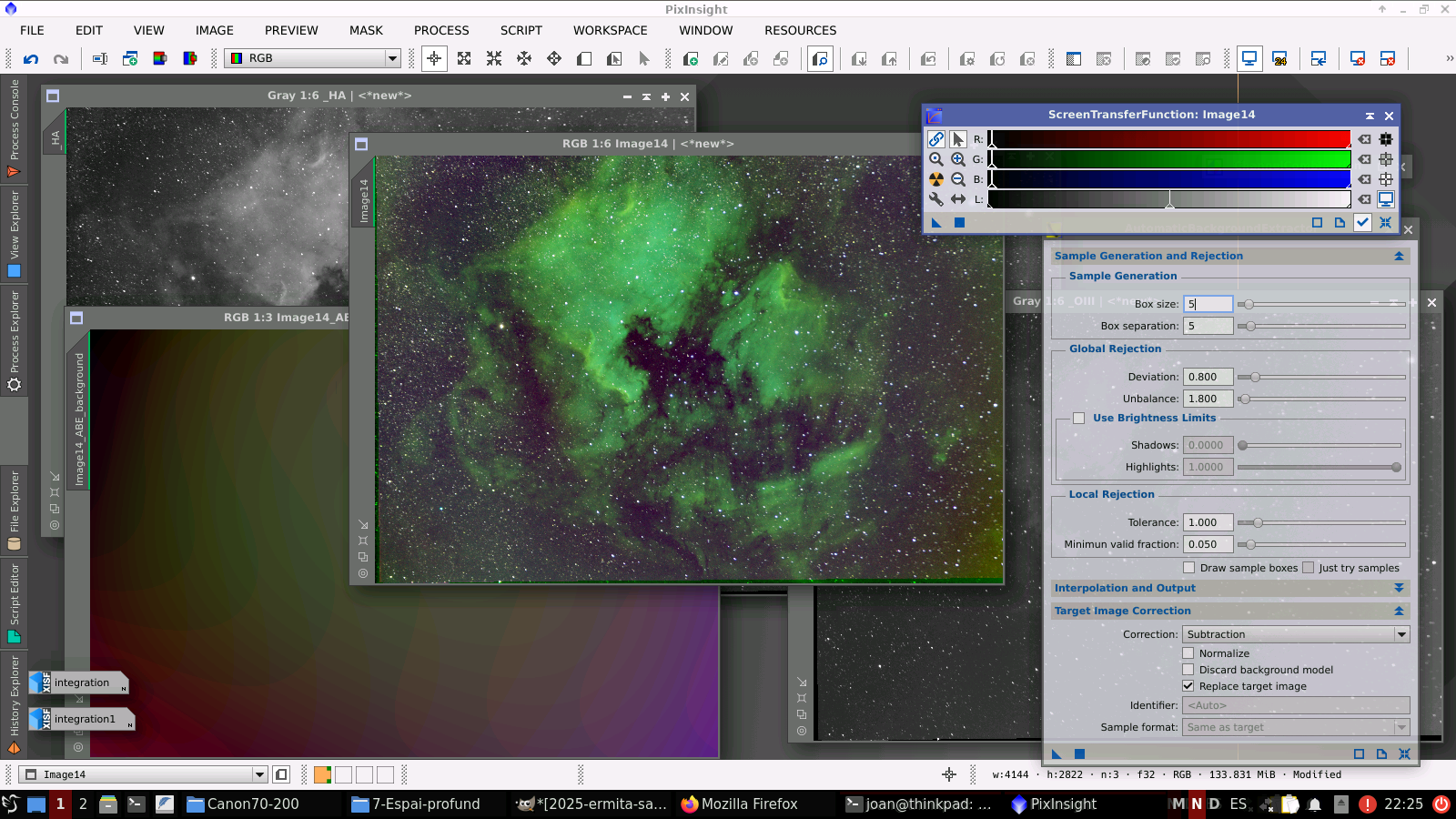 Obrirem els MasterLights de Ha/OIII i el de SII/OIII i veurem que, a banda dels masterLight ens mostra les dues imatges rebujades pel soroll i distorsions: la rejection_hight i la rejection_low:
