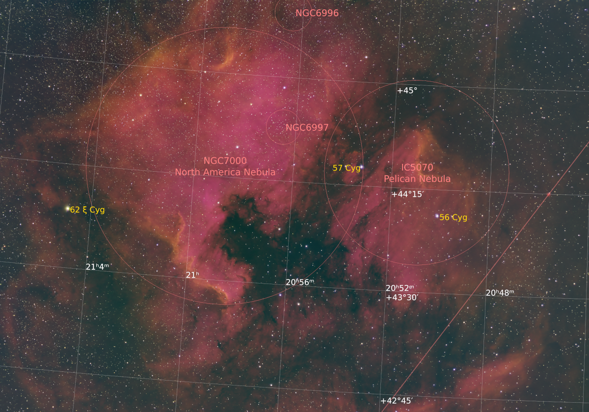 Doncs ací tenim la nebulosa NGC7000 (Nord Amèrica) i el Pelicà (IC 5067), dues nebuloses d'emissió en la constel·lació del Cigne, situades a prop de l'estrela Deneb: