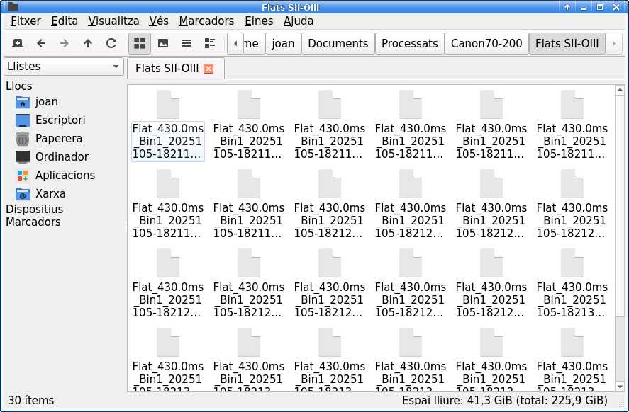 I ací et deixe captures de pantalla dels fitxers generats durant la captura (Lights) i els fitxers necessaris per a fer la calibratge. Molt ben aconsellat pels dos companys de la SAC, Alberto Sol i Ferran Bosch, vaig fer els Darks com sempre (mateix temps d'exposició que els Lights i mateix gain i temperatura), els Flats per a cada un dels filtres configurant l'exposició en "auto" i després no vaig fer Bias sinó Dark Flats, perquè amb l'ASI294MC Pro pot ser els Bias massa ràpids poden crear problemes de calibratge i els Dark Flats en canvi fan una millor calibratge i aconsegueixen millor fons. El truc dels Dark Flats, al contrari que els Bias és tapar el tub i estar a les fosques completament per a que no entre llum però agafant el mateix temps d'exposició idèntic que quan em fet els Flats.