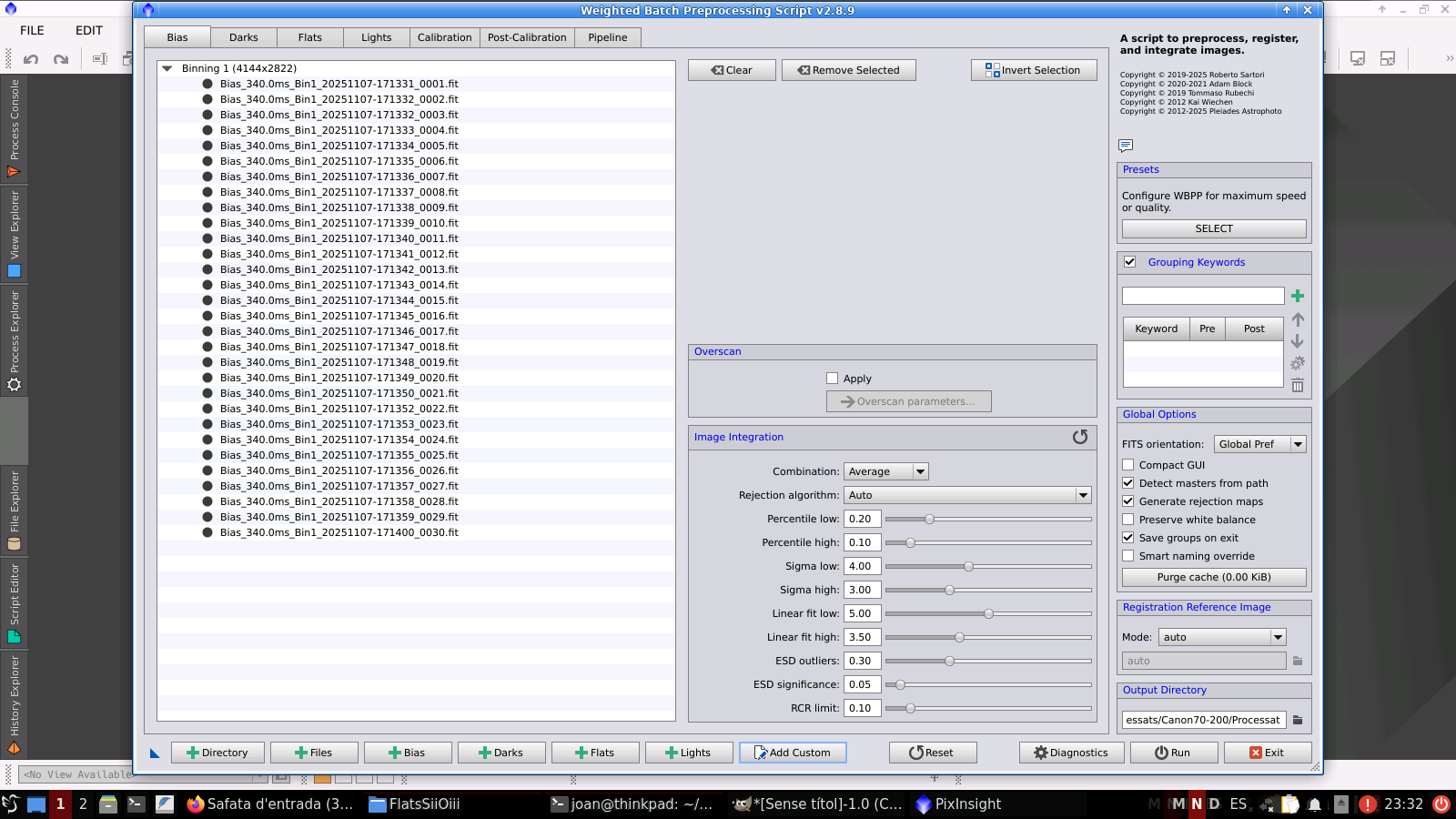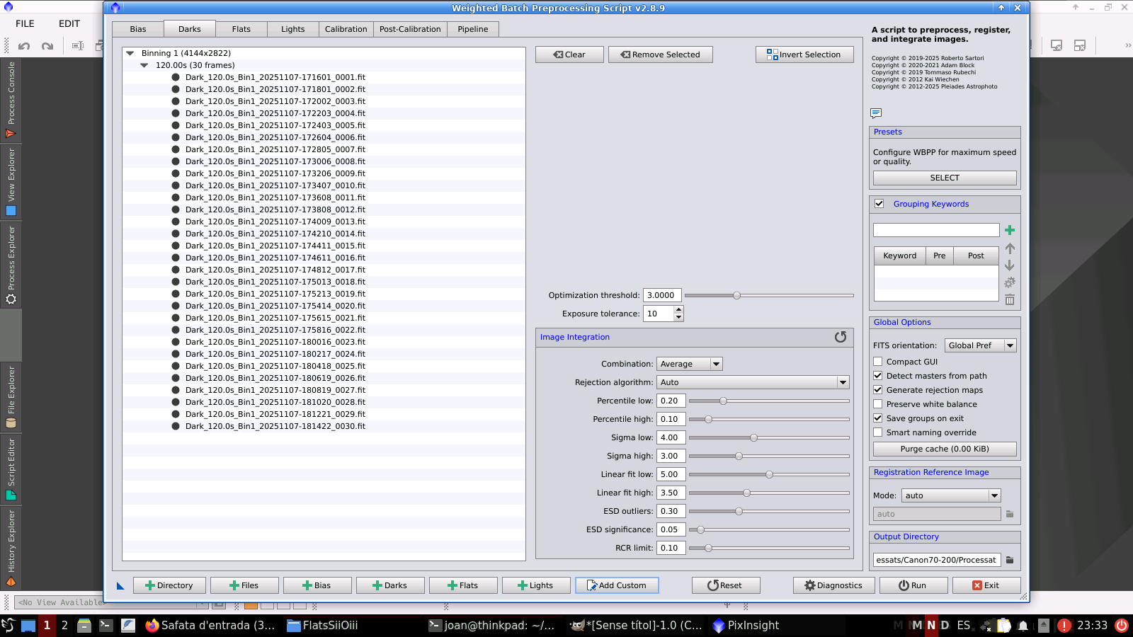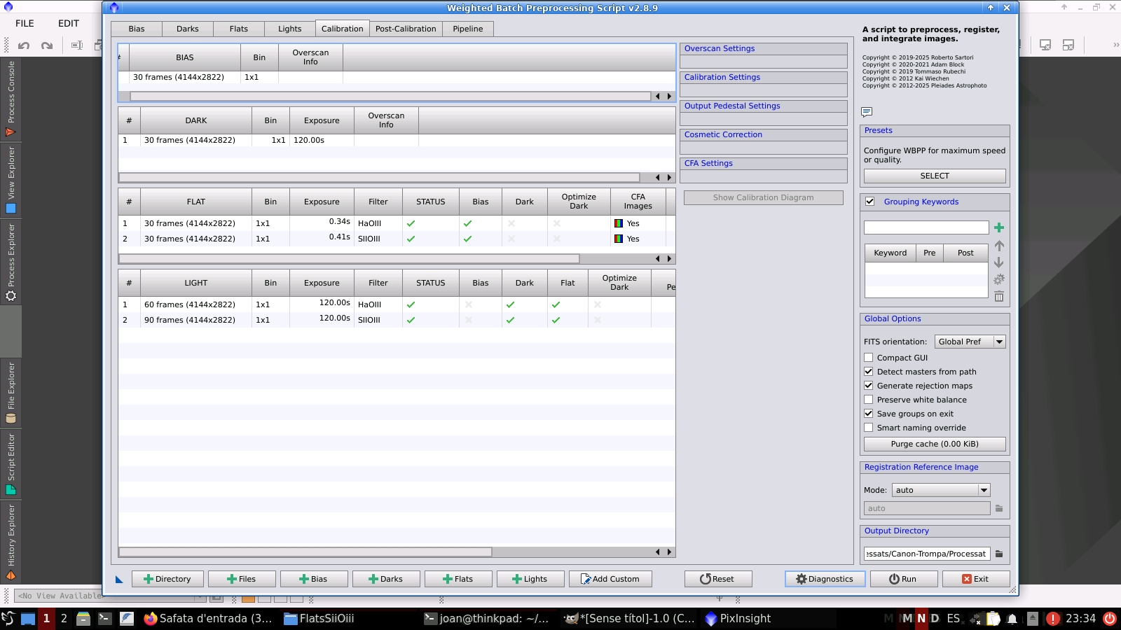 Ací et mostre la captura de pantalla dels Darks, els 150 Lights (60 pel filtre D1 i 90 pel filtre D2), els Flats i, encara que estiga en la pestanya dels Bias, són Dark Flats amb el mateix temps d'exposició que els Flats i la mateixa temperatura que els Lights: