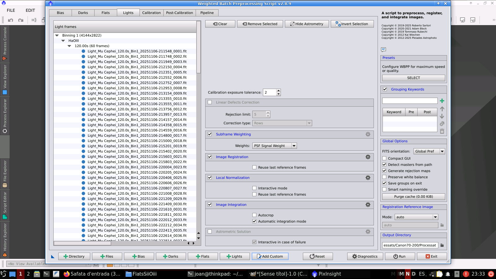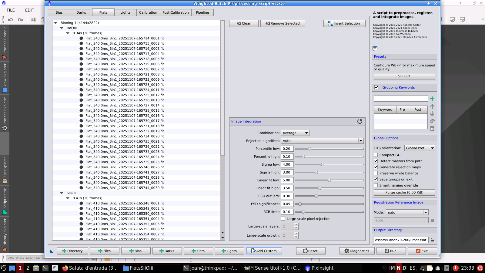 És important tenir els fitxers ben ordenats per a que WBPP treballe sense problemes. Cal, per tant, especificar en "Add custom" els Lights dels diferents filtres per a que WBPPP sàpiga quins són els Lights del filtre Askar D1 Ha/OIII i quins són els Lights del filtre D2 SII/OIII. I el mateix amb els Flats que he fet amb el filtre D1 i els Flats del filtre D2.