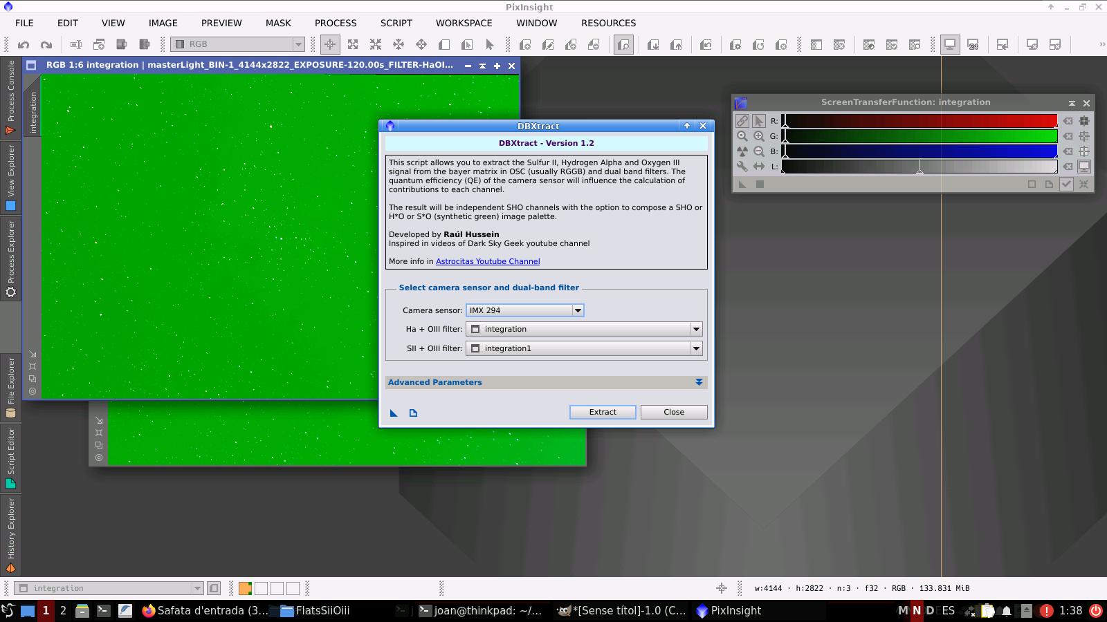 Doncs bé, tancarem aquestes finestres de Rejection Low i Rejection High i ara obrirem el procés DBXtract, desenvolupat per Raul Hussein (AVA, Astrocitas) el qual treballa molt molt molt bé separant dels meus dos Lights dualband les bandes espectrals per a que les puguem tenir de manera separada: el Hidrogen alpha, l'Oxigen III i el Sulfúr II. Després, aquestes imatges separades poden ser manipulades individualment per maximitzar la qualitat del processament abans de combinar-les, ja siga en una representació SHO (o paleta Hubble) o altres combinacions que permetin ressaltar diferents aspectes de l'objecte d'estudi.