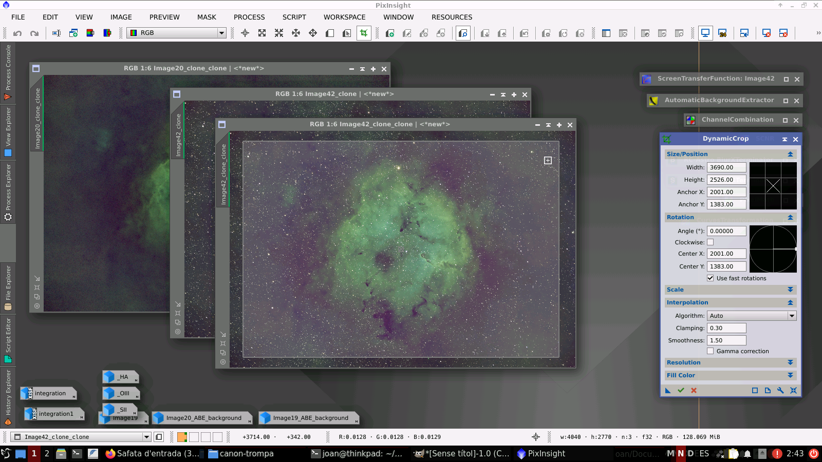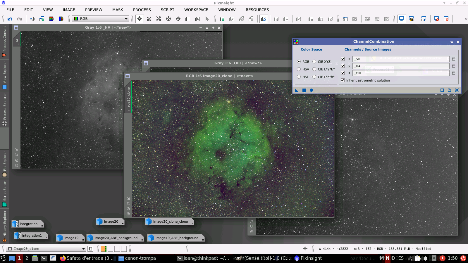 I una de les coses que acostume a fer és passar-li el procés AutomaticBackgroundExtractor (ABE) perquè moltes voltes em fa el que necessite sense complicacions. De totes maneres, part de la imatge la retallaré més endavant. Pots veure la qualitat de la imatge amb color combinada amb ChannelCombination, molt verda :) però amb moltíssims detalls:
