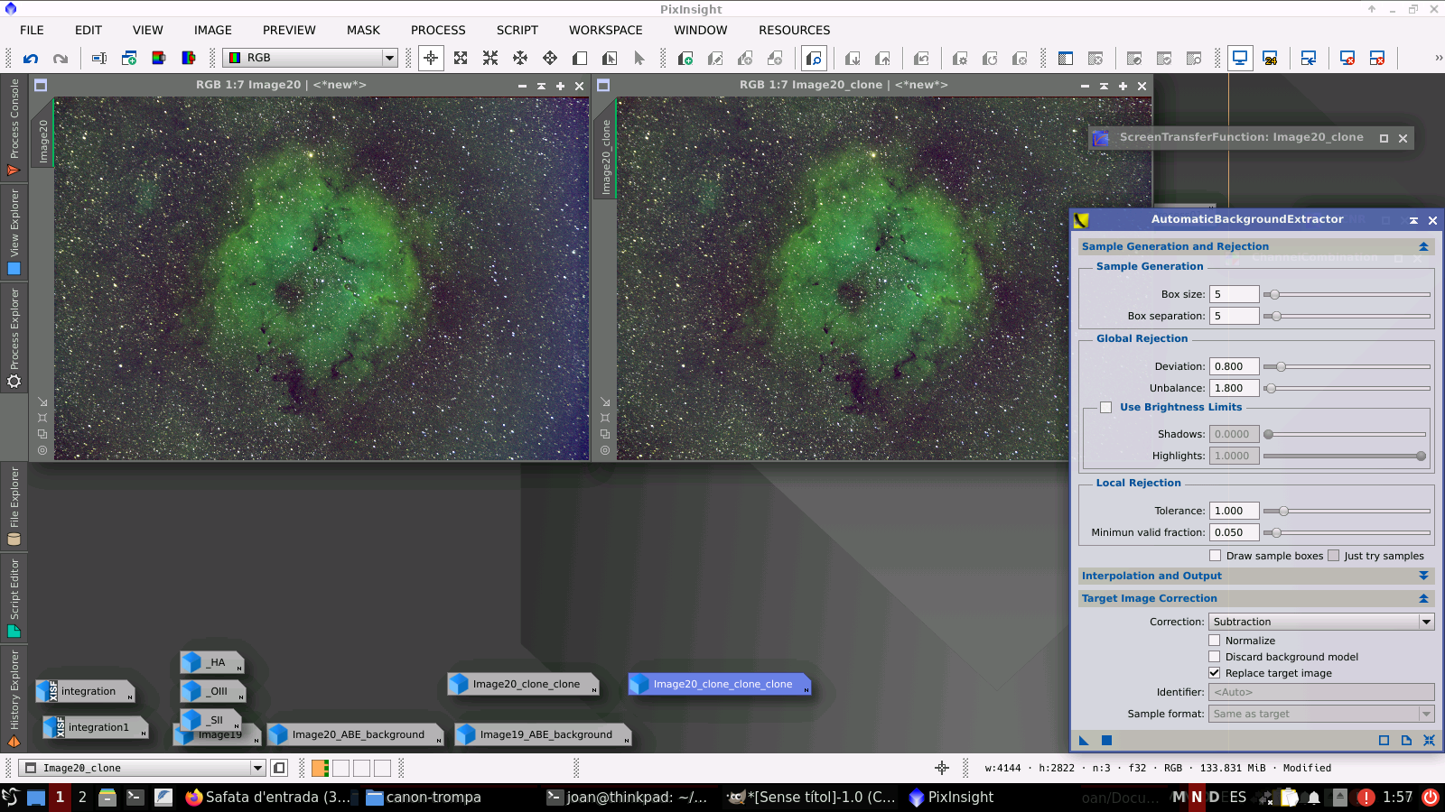 Ací pots veure la diferència abans de passar-li el procés AutomaticBackgroundExtractor (ABE), en la imatge de l'esquerra, i després de passar-ho, en la imatge de la dreta: