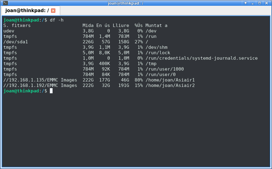 I ara anem a dotorejar quina capacitat tenen, podem fer df -h per a veure les unitats que tenim muntades i la seua capacitat de disc. Ací pots veure que tinc 46 Gigues en l'AsiAir nº1 i 191 Gigues en l'AsiAir nº 2: