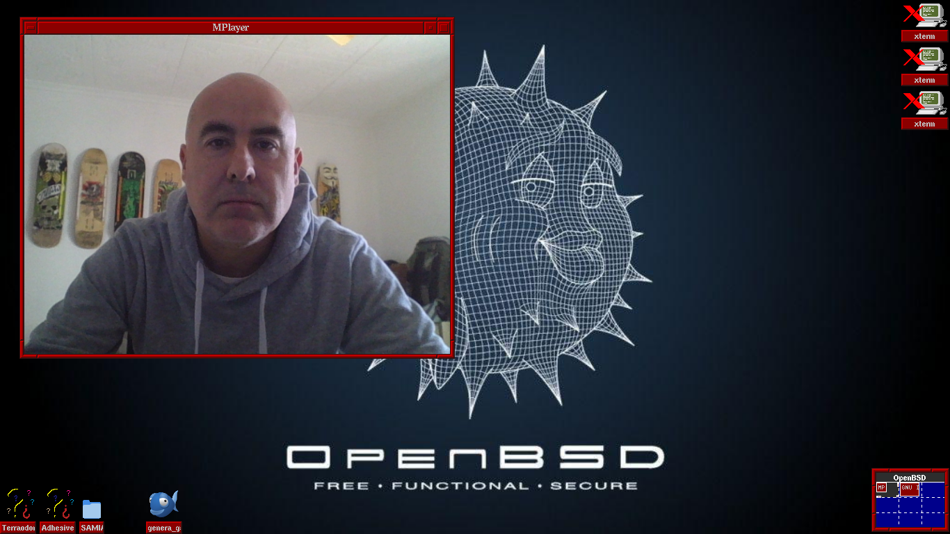 Ací tens algunes captures de pantalla d'OpenBSD 7.8 amb l'escriptori fvwm amb el navegador iridium, una captura de pantalla mostrant l'editor bluefish editant un xicotet programa meu escrit amb Python, una captura de pantalla de l'explorador de fitxers thunar i una altra mostrant el video des de la Webcam: