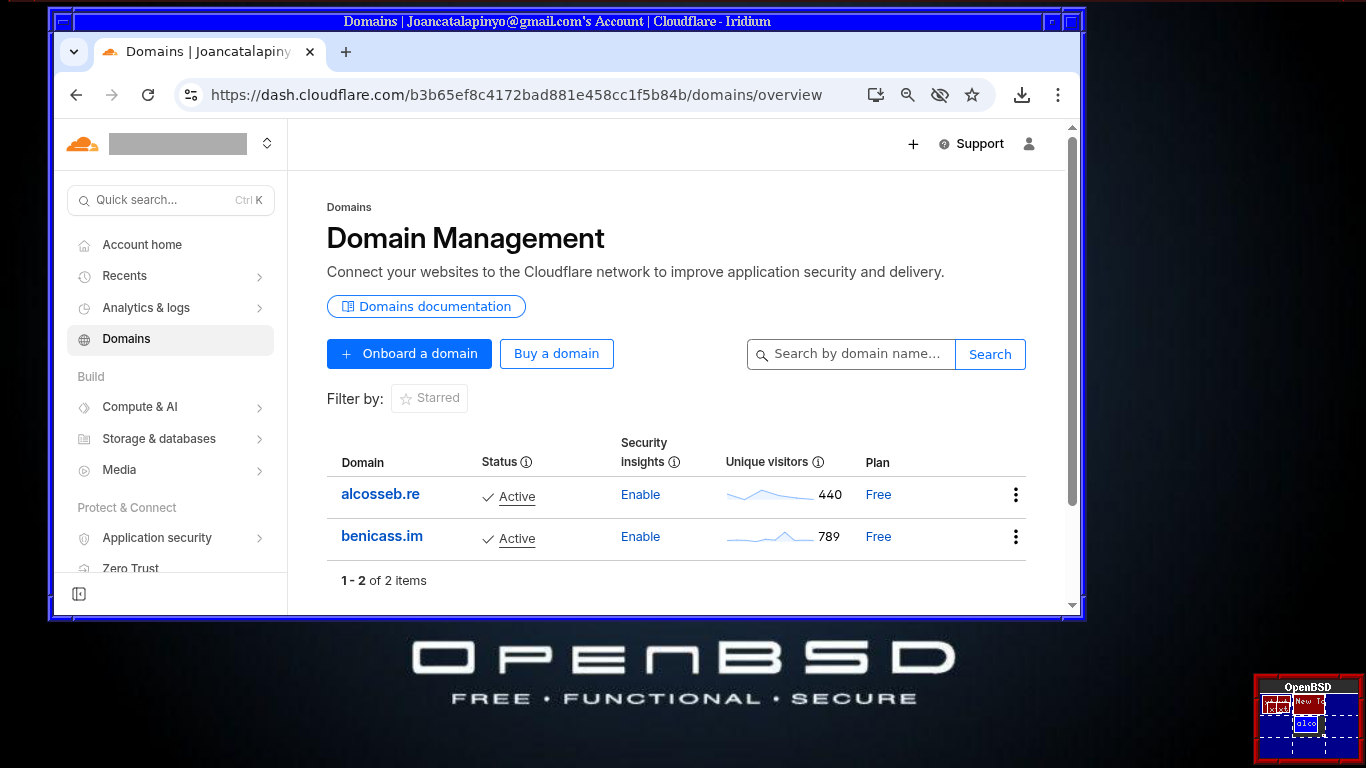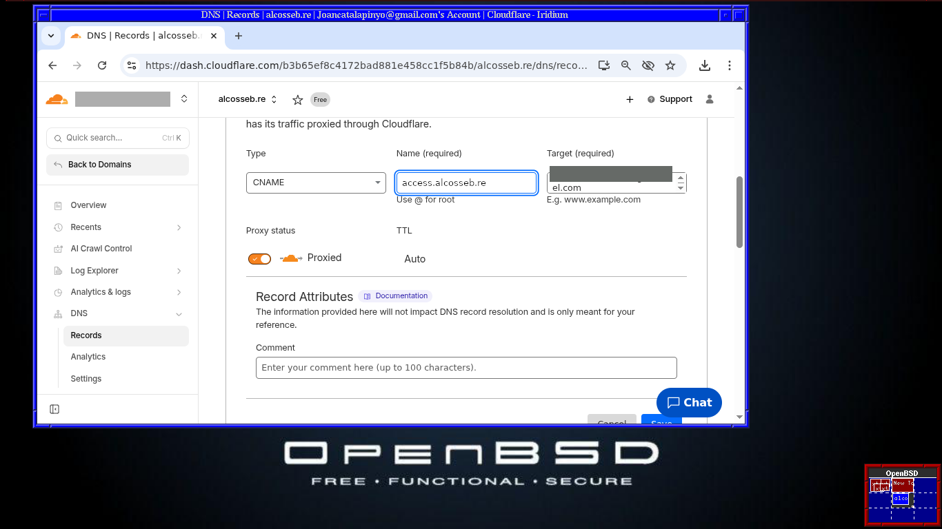 Ara necessite afegir un nou domini o subdomini en panel de control de Cloudflare on gestione els DNS dels meus dos dominis https://alcosseb.re/ i https://benicass.im. Aleshores ens autenticarem en la web de Cloudflare i afegirem el CNAME amb un domini o subdomini (subdomini en el meu cas) des d'on voldrem accedir al túnel via SSH:
