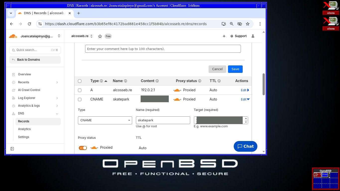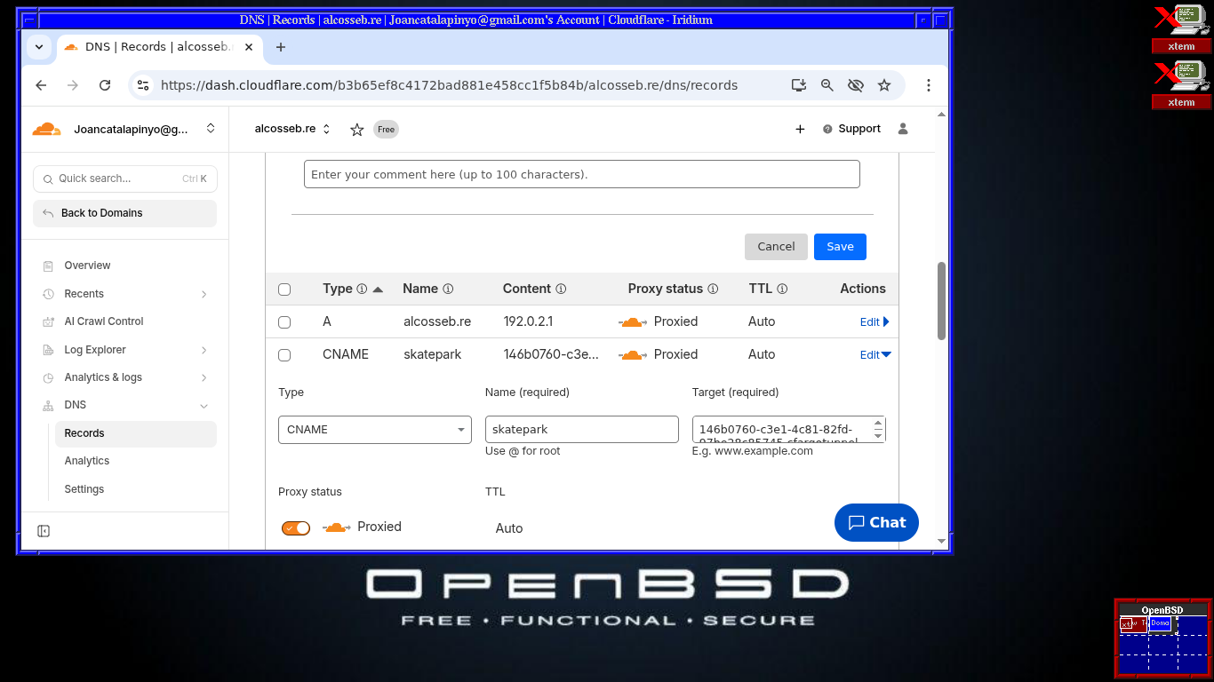 Afegirem una entrada, de tipo CNAME, amb nom "skatepark" i el valor serà EL_MEU_CODI..cfargotunnel.com. I desem aquesta configuració.