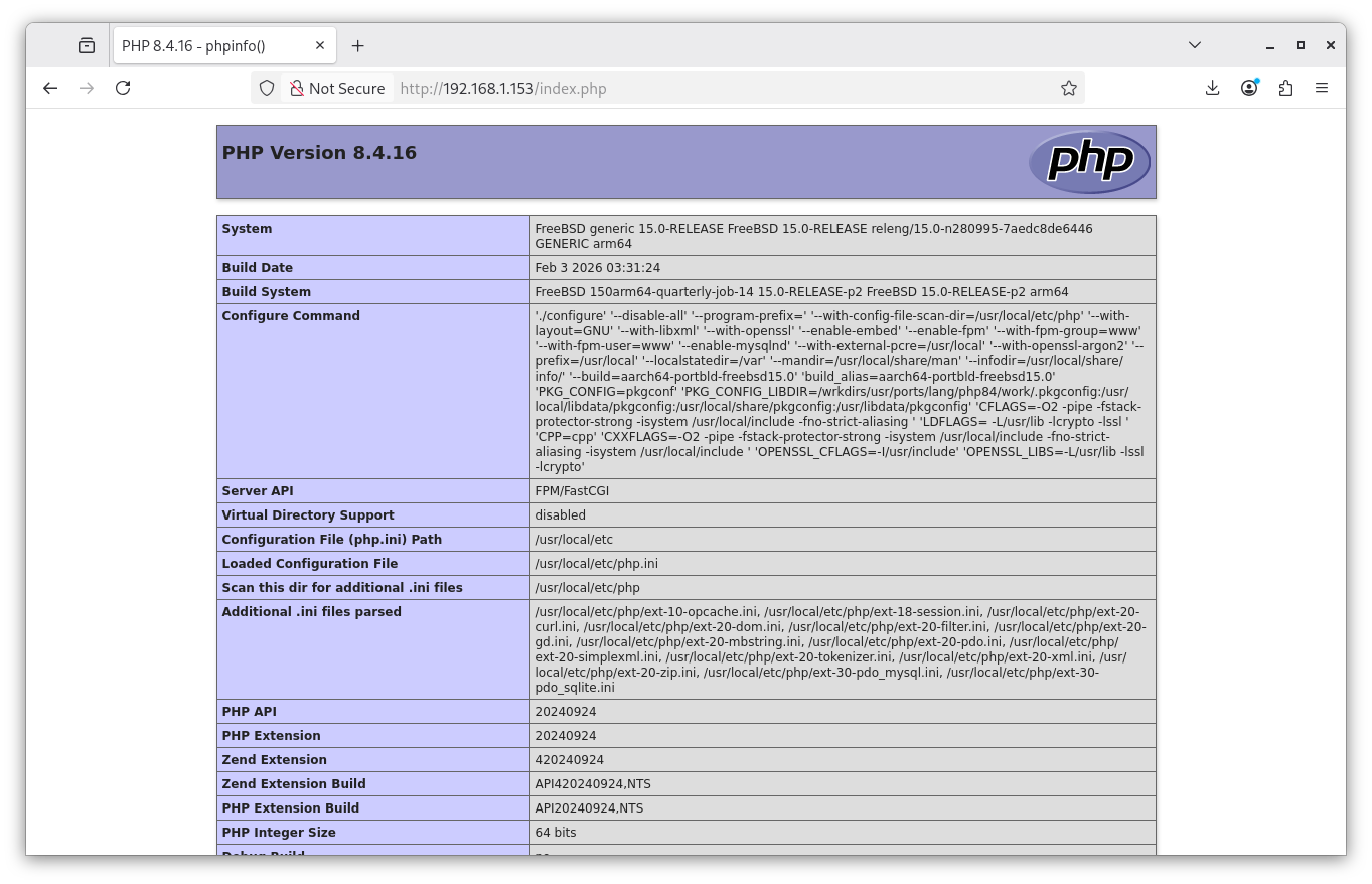 $ doas pkg install php84 php84-curl php84-gd php84-opcache php84-pdo_mysql php84-xml php84-zip php84-tokenizer php84-dom php84-filter php84-session php84-simplexml php84-mbstring php84-pdo_sqlite