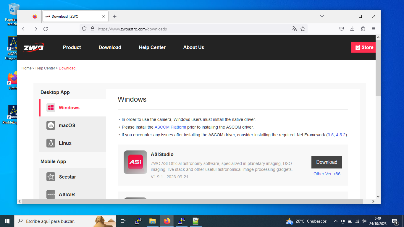 Ara anirem a la web de ZWO i en l'àrea de descàrregues instal·larem ASIStudio, a continuació els drivers de les de les càmeres ASI ZWO i finalment el ASCOM Driver que apareix en tercer lloc en la pàgina.