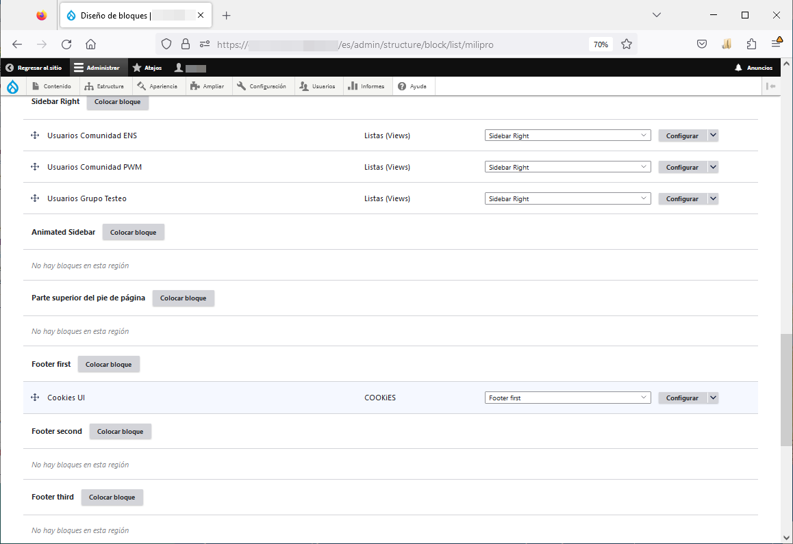 I bé, una vegada instal·lem el mòdul COOKiES Consent Management i despleguem la llibreria js-cookie, ja podem mostrar el consentiment de les cookies en qualsevol regió del nostre theme lliurement. En el meu cas, l'he activat en una regió anomenada Footer first: