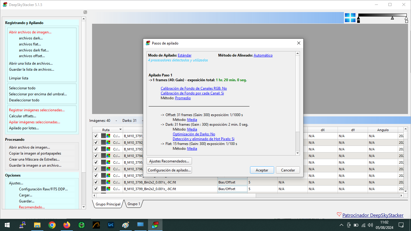 I finalment, per apilar els lights que he fet amb el filtre de SII, farem el mateix que amb els altres dos que acabem d'explicar, és a dir, apilarem tots els lights, tots els darks i tots els offsetbias. Però nomès afegirem els 15 flats que he fet apuntant al cel però amb el filtre SII.