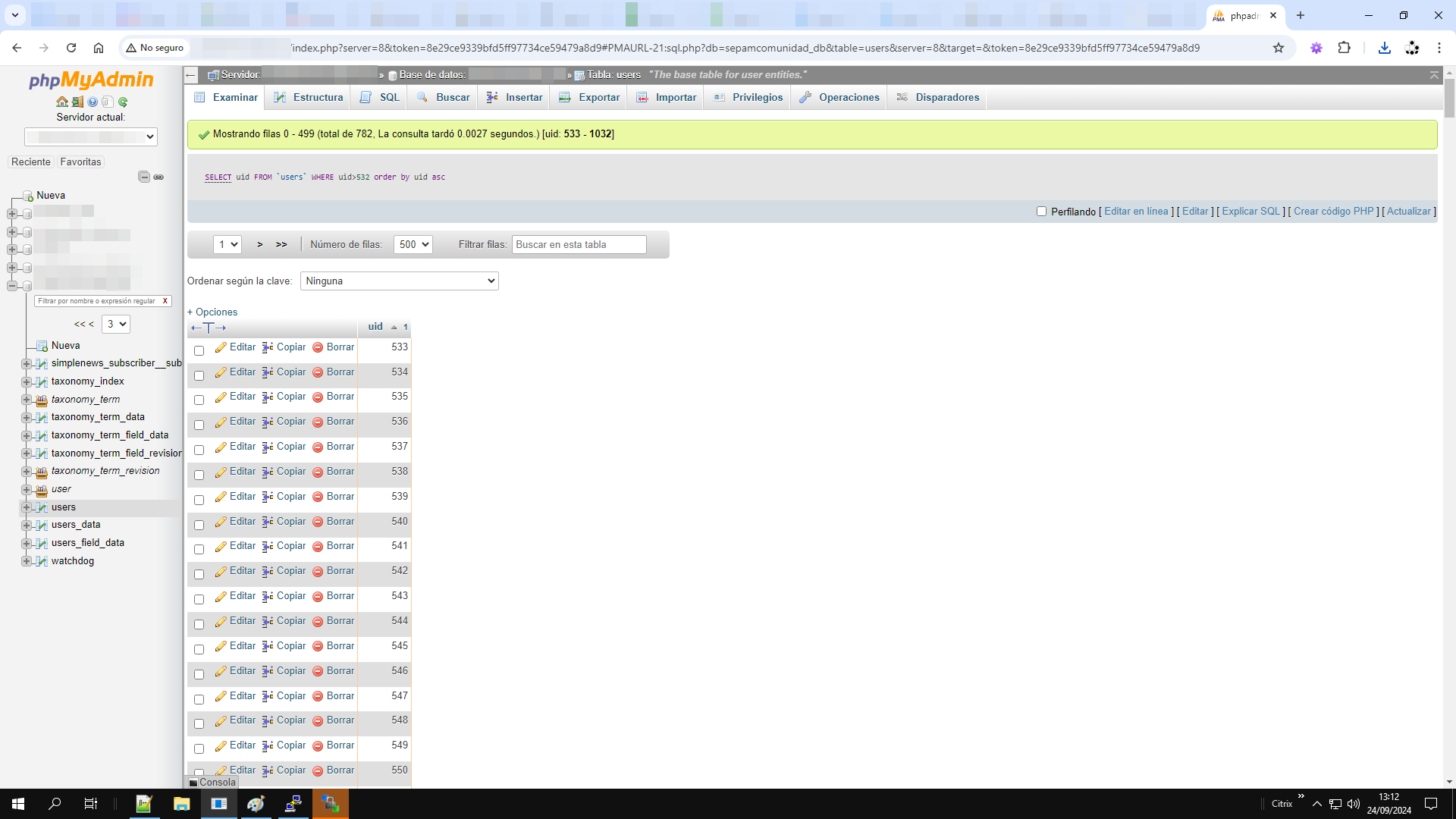 I com que hi ha més de 1000 usuaris i el gestor de bases de dades PhpMyAdmin de la meua feina nomès mostra resultats paginats fins a un màxim de 500 línies, he hagut de fer-ho en tres passos: