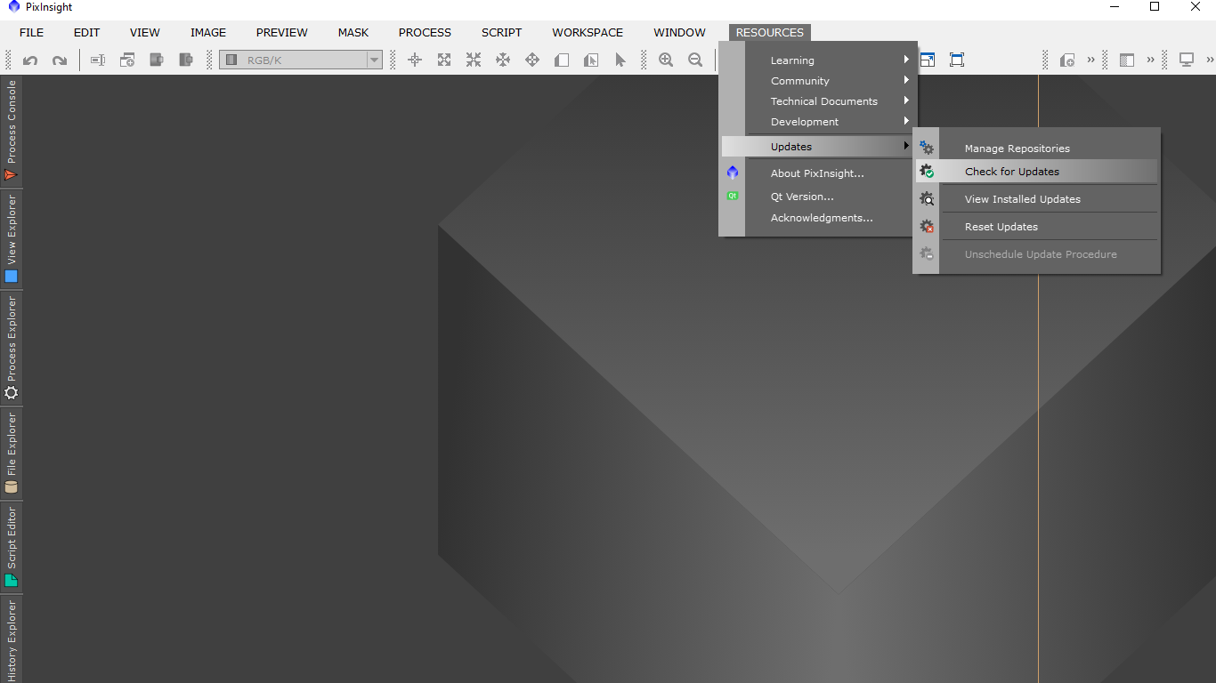 Ara anem al menú RESOURCES > Updates > Check for Updates per a actualitzar els scripts de PixInsight: