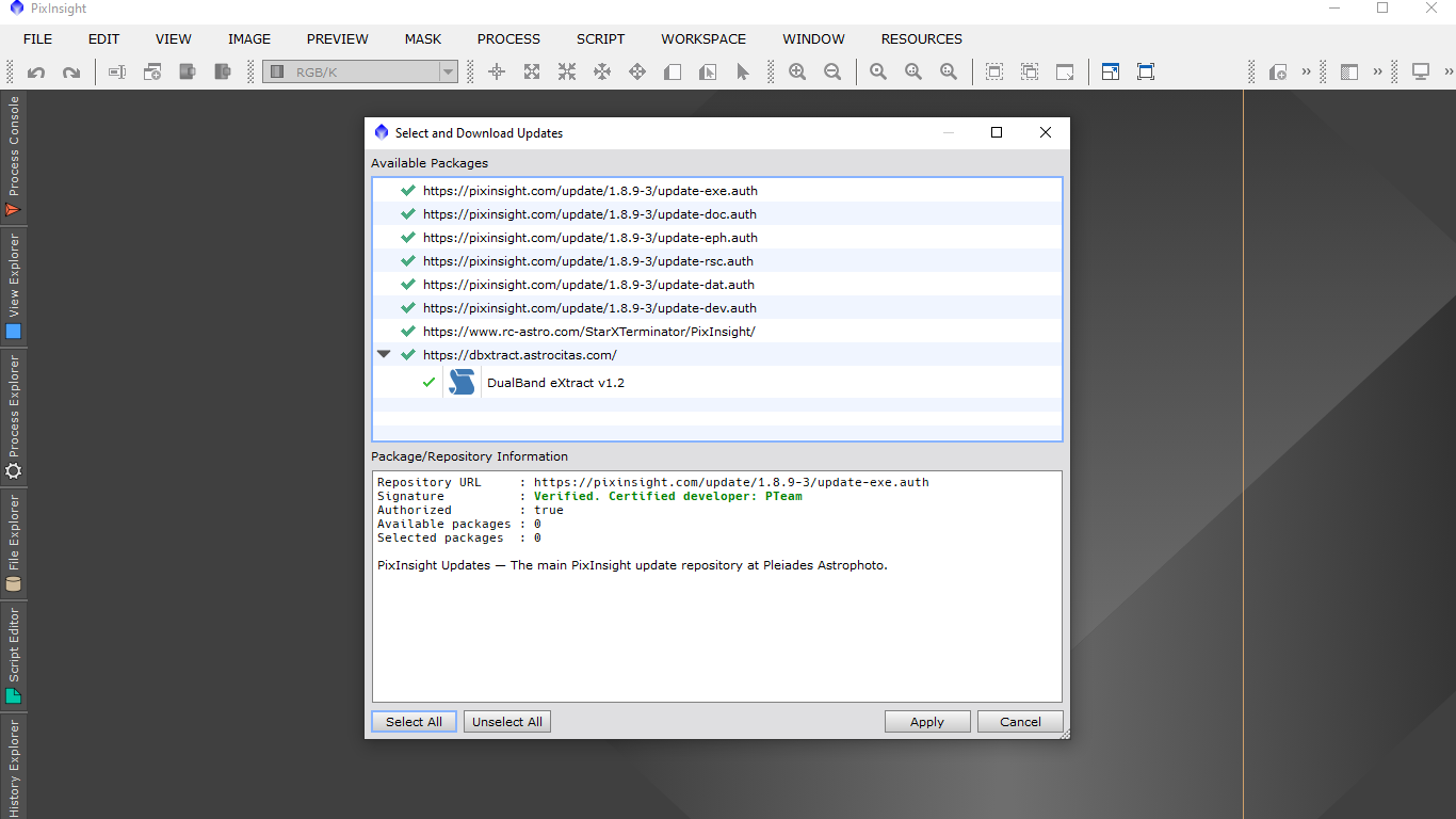 I ja ens apareixerà la finestra amb actualitzacions pendents de PixInsight. Nosaltres marcarem (si no ho està ja) el nou script, en el meu cas DBXtract, i guardem: