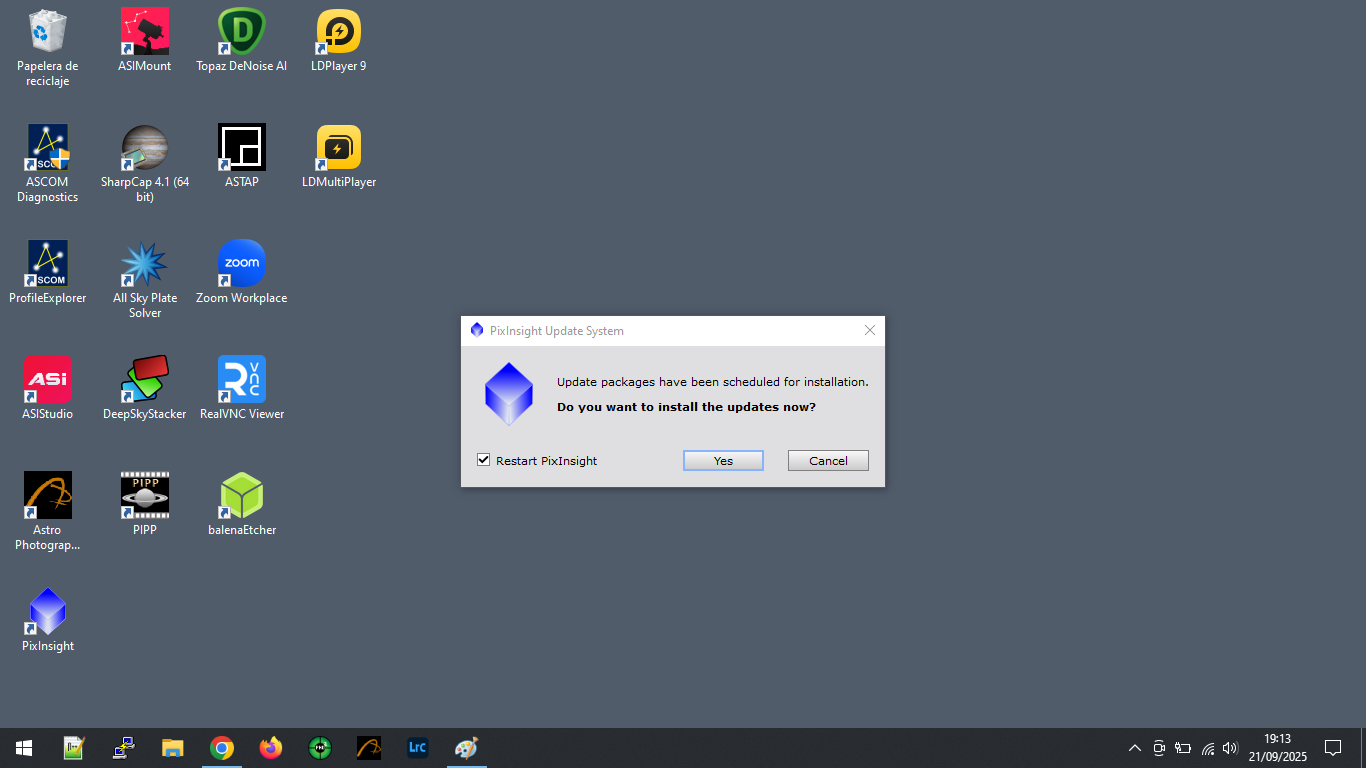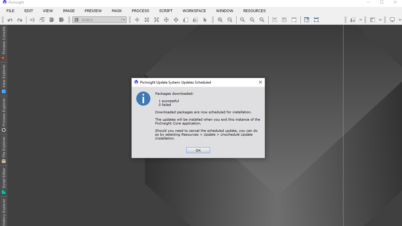 I es mostrarà la següent pantalleta que ens diu que PixInsight pren nota de les noves incorporacions i que ho farà en el pròxim reinici: