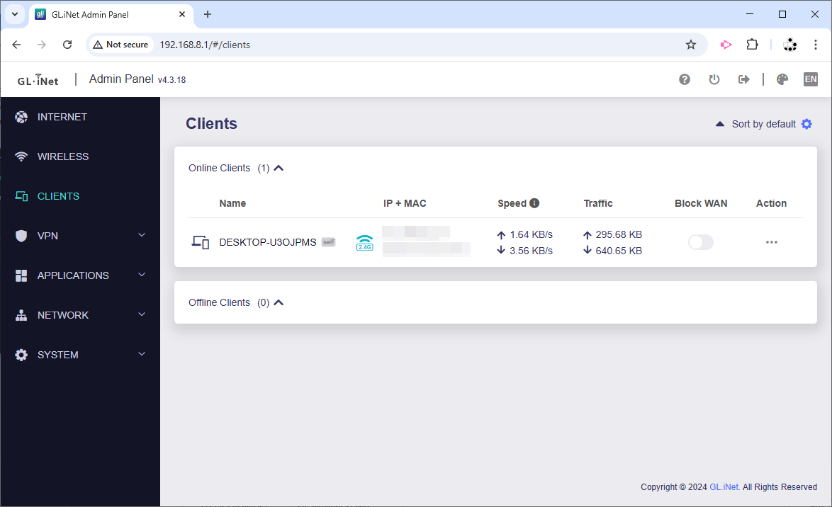 En la secció de CLIENTS podem veure les IPs que estan connectades al mini router i podem fer diferents accions com bloquejar-los l'accès a internet, per exemple: