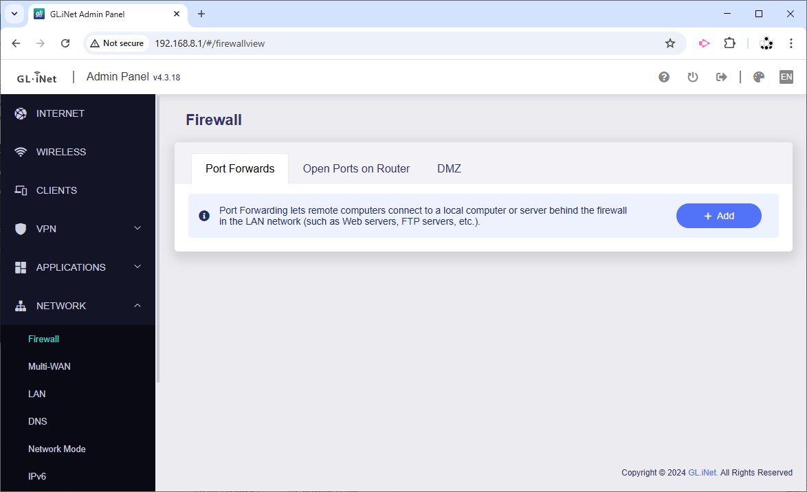 En la secció NETWORK > Firewall podrem controlar la NAT dels ports del mini router. Açò ens ofereix moltíssimes possibilitats com podràs imaginar :) Una opció imprescindible per a observatoris astronòmics remots, ja que permet controlar l'ordinador o AsiAir des de qualsevol lloc d'internet:
