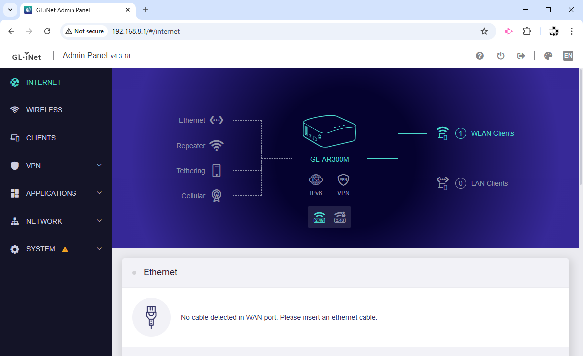 Aquest router mini router SHADOW GL .iNet GL-AR300M16 ens permet crear una LAN (Local Area Network en anglés)amb internet o sense, segons vullguem. Si volem internet, caldrà connectar el router a un altre router que sí tinga internet. Però encara que no estiga connectat a un router amb internet, generarà Wifi i crearà una LAN on cada equip connectat a ell tinga una IP, per tant dins d'eixa xarxa local funcionarà Escritorio Remoto de Windows, funcionarà VNC i noVNC, podrem compartir dades i copiar-nos les imatges .fits que faça el telescopi i guardar-les en el nostre ordinador, etc.