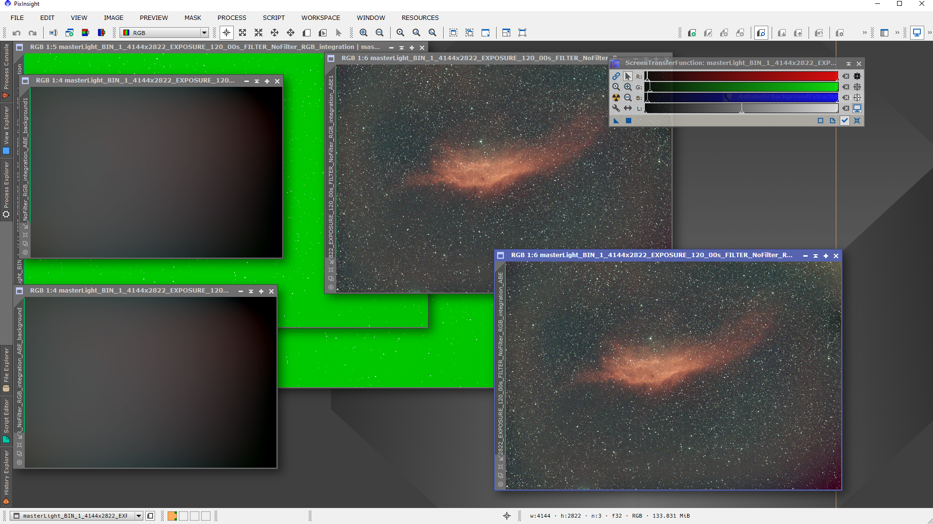 Una vegada finalitzat el treball que fa WBPP, he obert els master Light. Veuràs un fons verd, però això és normal ara en aquest punt del procès. Un master Light és el normal, i l'altre és un master Light amb "autocrop", és a dir, que PixInsight ha retallat els bordes de la imatge quan ha considerat que falta llum o no està ben alineada la imatge i té algun defecte o falta d'informació: