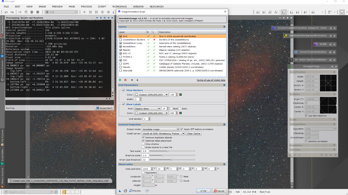 I una vegada ens fa la resolució de plaques, anirem a l'script Image Annotation de PixInsight i seleccionarem les biblioteques d'objectes on volem cerque i identifique eixos objectes en la imatge: