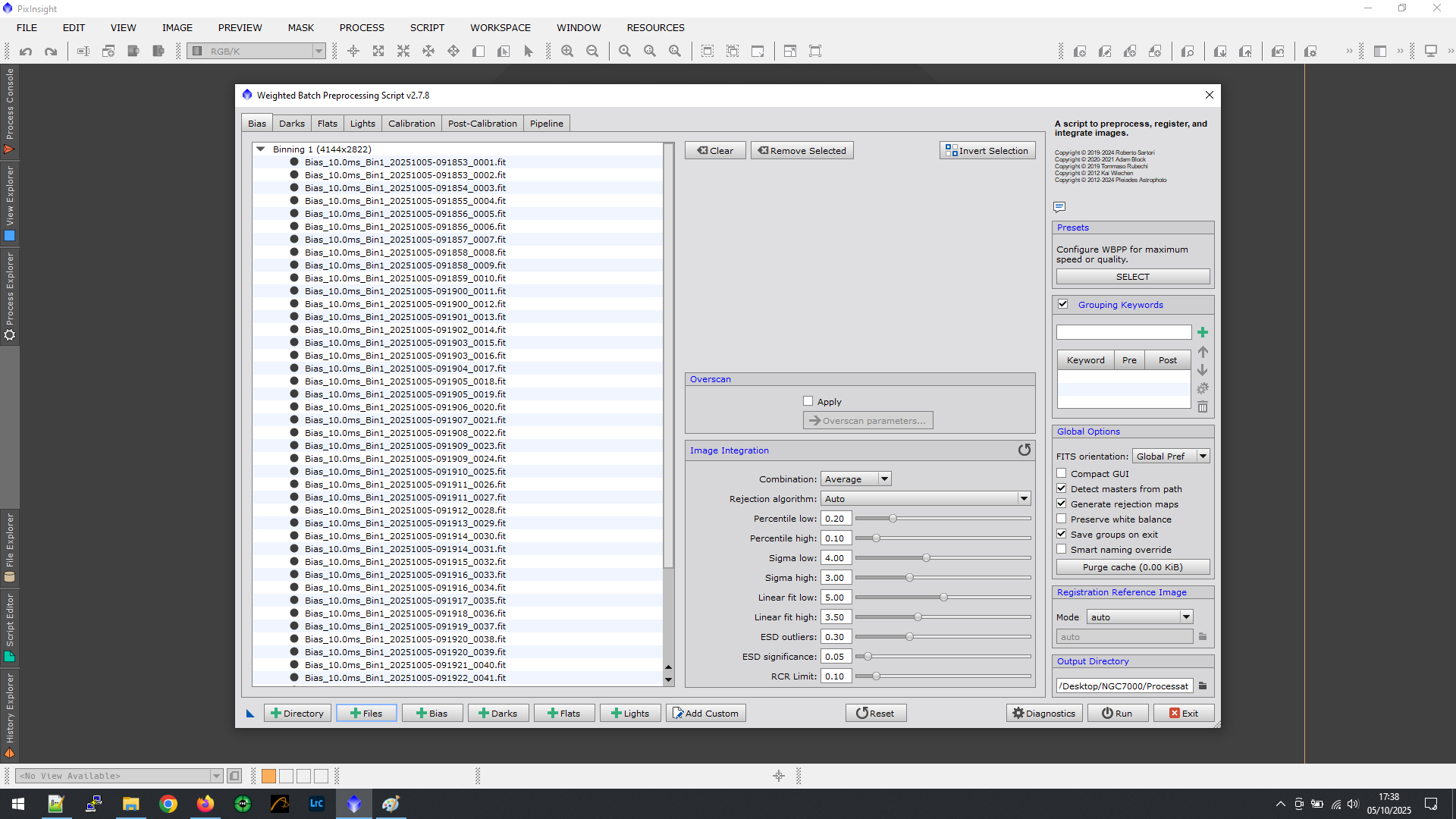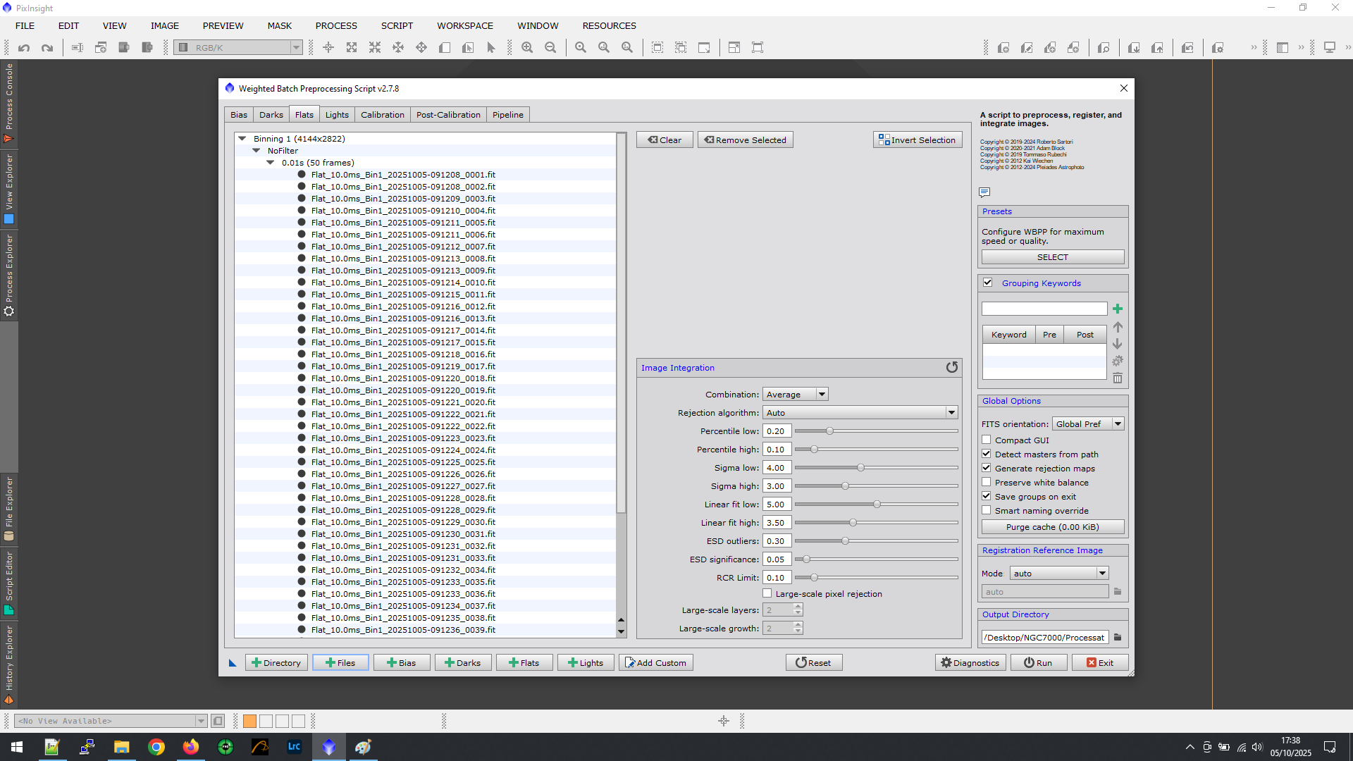 I últimament estic alineant, apilant i calibrant amb PixInsight, aleshores vaig obrir WBPP (Weighted Batch Preprocessing Script ) i vaig començar a configurar les tomes de calibració i Lights. No vaig fer Bias perquè segons he llegit a diversos fòrums, la meua càmera ASI294MC Pro no fa bé els Flats ràpids i recomanen fer Flats d'aproximadament 2 a 5 segons i també no fer Bias sinó Dark-Flats amb la mateixa temperatura i temps d'exposició que els Flats: