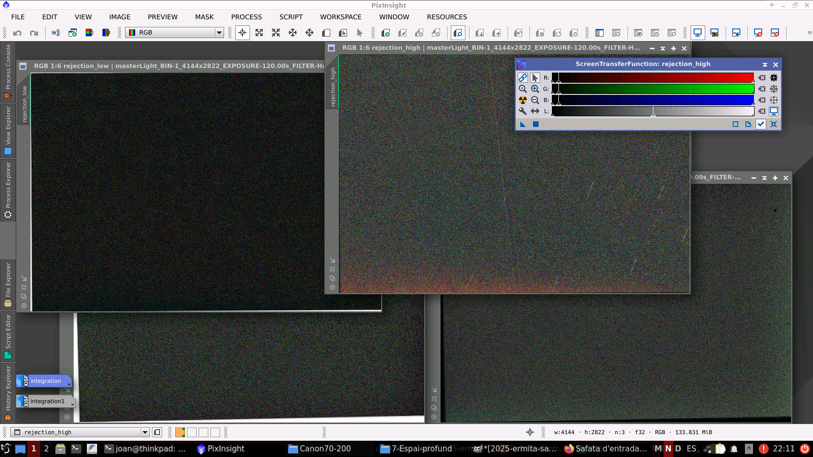Obrirem els MasterLights de Ha/OIII i el de SII/OIII i veurem que, a banda dels masterLight ens mostra les dues imatges rebujades pel soroll i distorsions: la rejection_hight i la rejection_low: