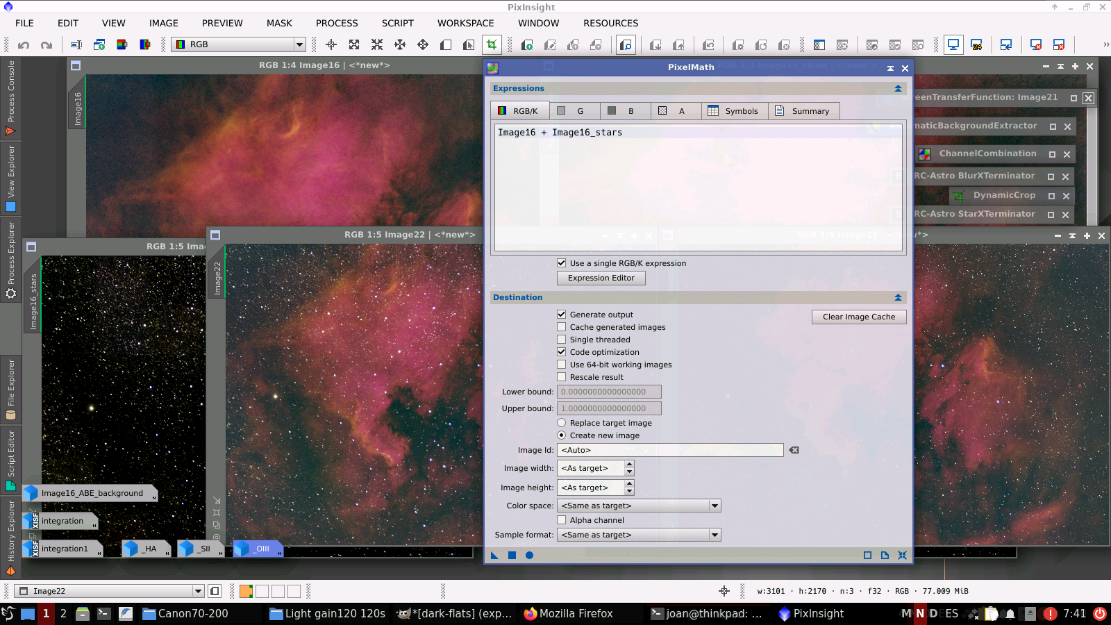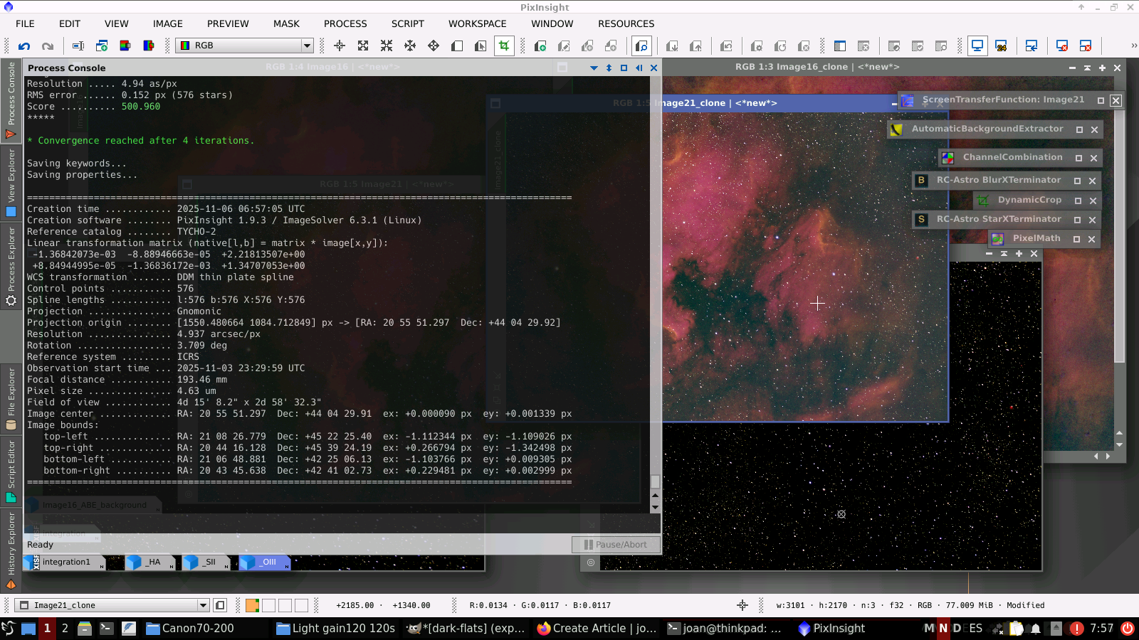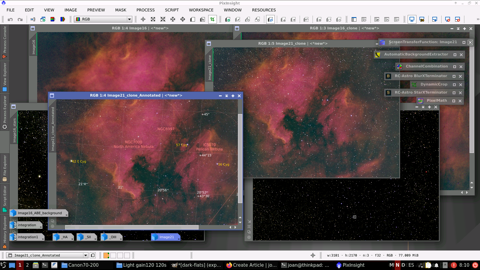 Aquesta vegada el repte era triple, volia provar un nou objectiu fotogràfic, el Canon 70-200 F/2.8, del qual m'han parlat molt bé dos companys de la Societat Astronòmica de Castelló, Luis Robledo i Ferran Bosch, vaig improvissar-me un dock per a fer-ho servir. El segon punt era processar nebuloses d'emissió (NGC7000 Nord Amèrica i IC 5067 el Pelicà) baix el cel Bortle7 que tinc a ma casa, però ara practicaria amb una càmera a color i dos filtres Askar Magic Colour dualband, el Ha/OIII i el SII/OIII, i en comptes d'extraure els colors R + G + B dels Lights, i asignar un color a Ha, a OIII i a SII, aquesta vegada volia practicar amb l'script DBXtract, desenvolupat per Raul Hussein, un astrònom valencià molt actiu en AVA i en el seu projecte Astrocitas. L'script DBXtract ens permet processar imatges de banda estreta capturades amb filtres dualband molt fàcilment i en questió de segons extreu els diferents Lights de manera molt bona i consistent.