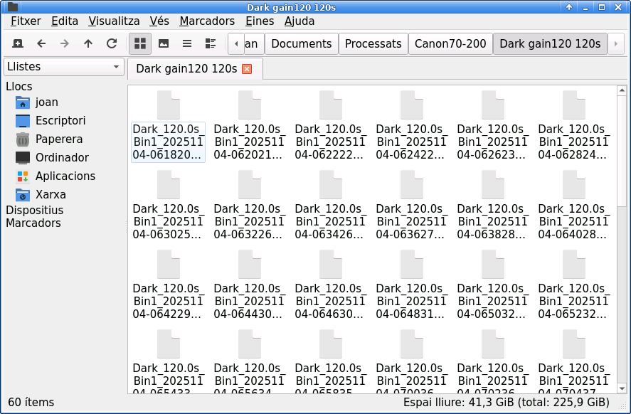 I ací et deixe captures de pantalla dels fitxers generats durant la captura (Lights) i els fitxers necessaris per a fer la calibratge. Molt ben aconsellat pels dos companys de la SAC, Alberto Sol i Ferran Bosch, vaig fer els Darks com sempre (mateix temps d'exposició que els Lights i mateix gain i temperatura), els Flats per a cada un dels filtres configurant l'exposició en "auto" i després no vaig fer Bias sinó Dark Flats, perquè amb l'ASI294MC Pro pot ser els Bias massa ràpids poden crear problemes de calibratge i els Dark Flats en canvi fan una millor calibratge i aconsegueixen millor fons. El truc dels Dark Flats, al contrari que els Bias és tapar el tub i estar a les fosques completament per a que no entre llum però agafant el mateix temps d'exposició idèntic que quan em fet els Flats.
