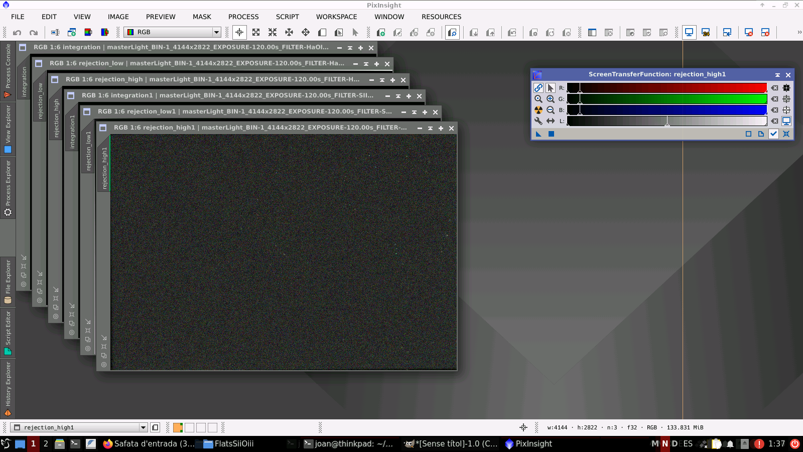 Ara obrim els masterLights, que són les imatges de cada filtre combinant totes les imatges de llum o Lights, i també veurem les dues pantalles de Rejection Low i Rejection High, que són imatges amb valors de pixels que poden ser anòmals o erronis, per exemple soroll, defectes, reflexos o desbordament de píxels.