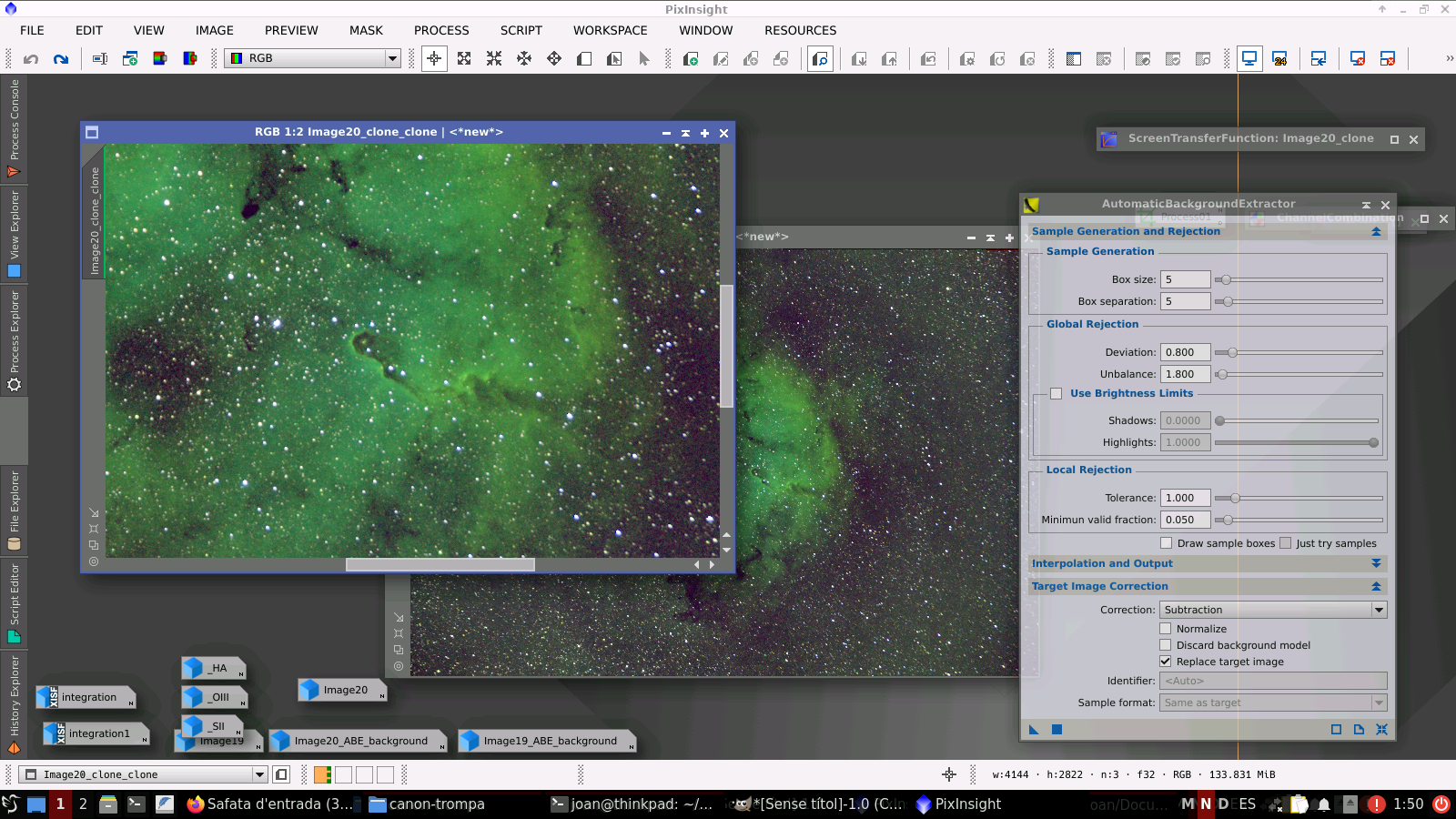 I una de les coses que acostume a fer és passar-li el procés AutomaticBackgroundExtractor (ABE) perquè moltes voltes em fa el que necessite sense complicacions. De totes maneres, part de la imatge la retallaré més endavant. Pots veure la qualitat de la imatge amb color combinada amb ChannelCombination, molt verda :) però amb moltíssims detalls: