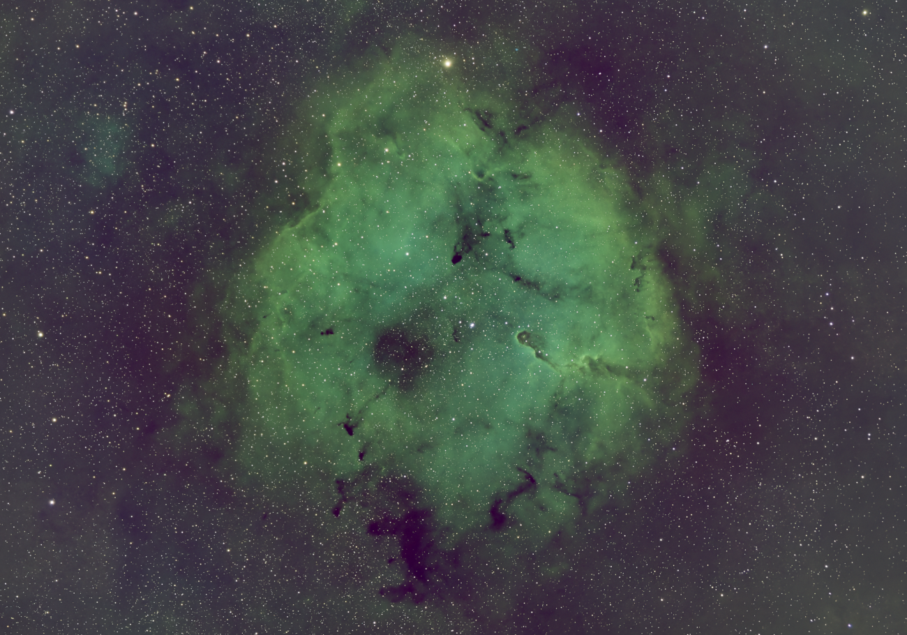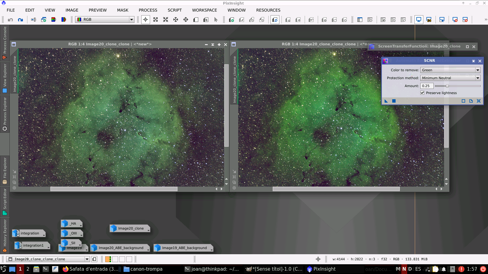 I tot i que la imatge té color verd predominant, li he passat el procés (Subtractive Chrominance Noise Reduction) SCNR, que redueix el color cromàtic (el color no desitjat) a les imatges, tot mantenint la informació d'alta qualitat. Aquest procés s'aplica generalment sobre l'canal de color (per exemple, el canal de verde o magenta), ajustant la intensitat de la reducció en funció de la presència del soroll en les imatges: