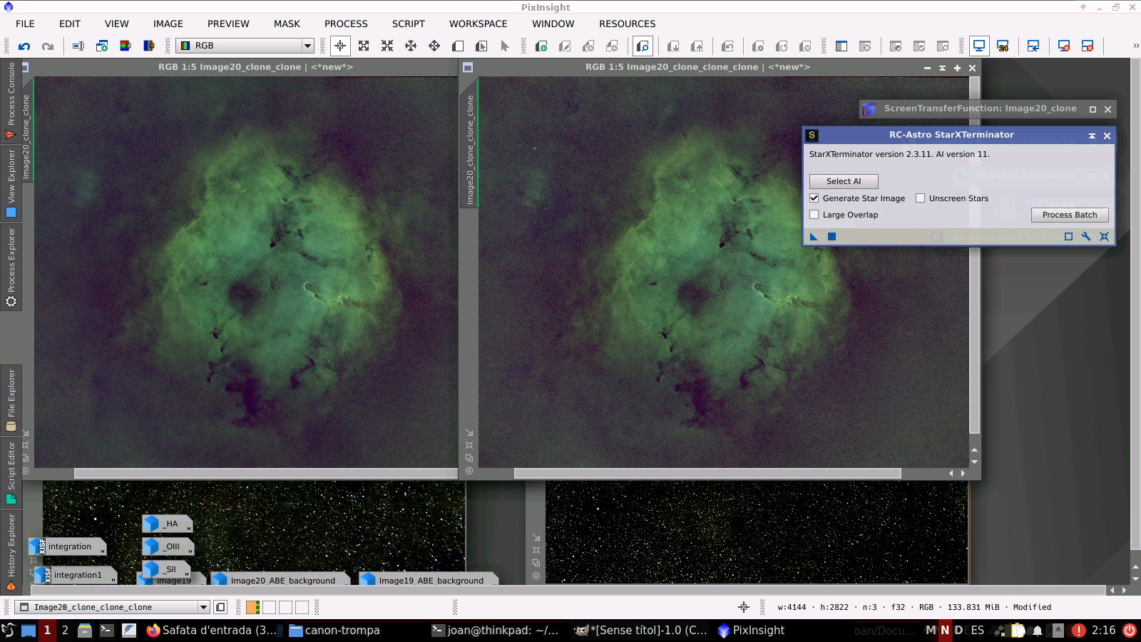 Ara li passe el meu procés favorit per a separar la nebulosa i les estreles, StarXTerminator. Cada vegada estic més maravillat amb la llum que puc agafar baix un Bortle7 amb els filtes Askar D1 i D2, crec que han segut una molt bona inversió :)