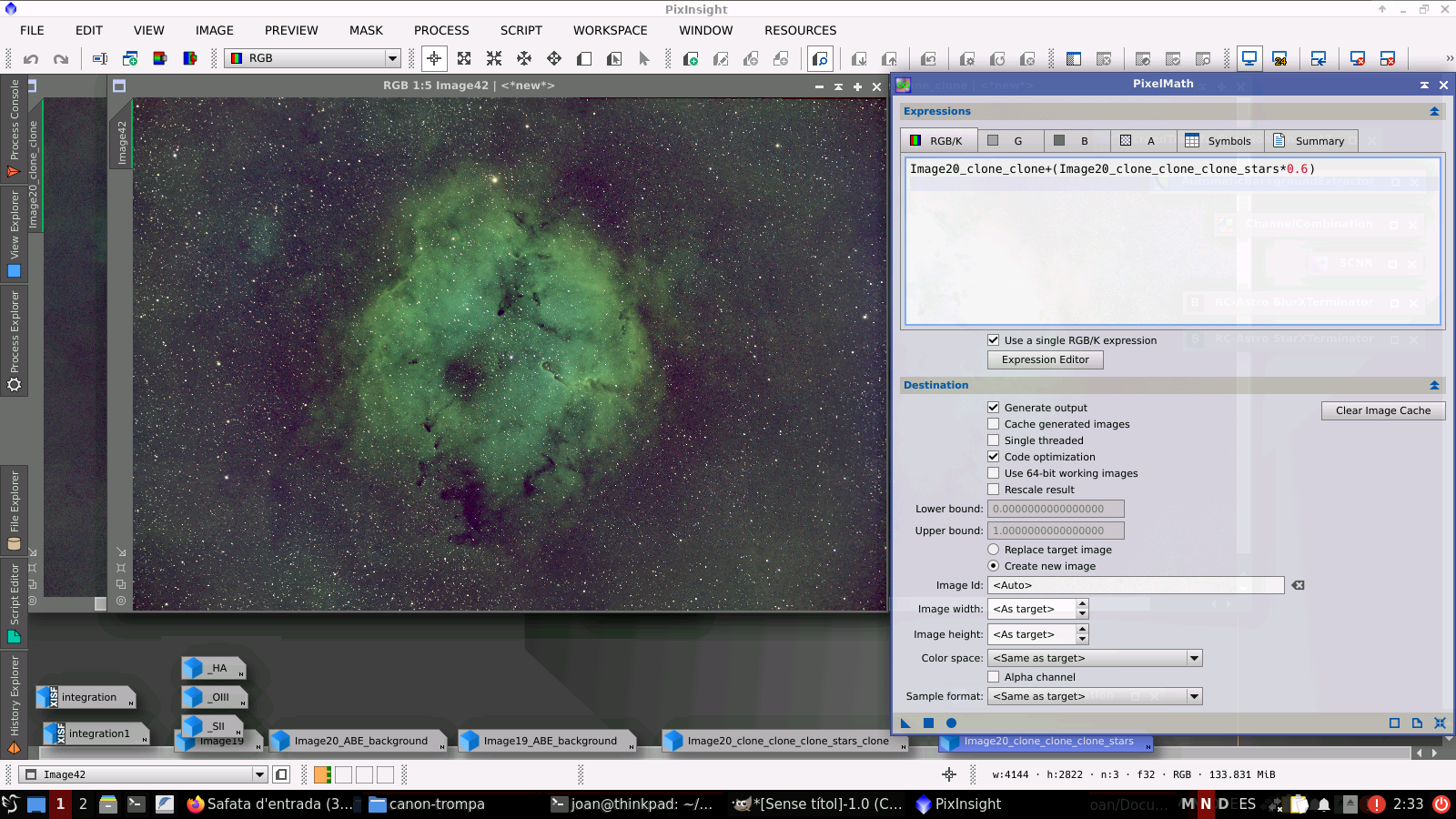 I ara vaig a tornar a recuperar les estreles amb PixelMath sobre aquesta nebulosa amb més contrast. Però jo vaig a fer una reducció d'estreles perquè el que pretenc és destacar la nebulosa i no fer una foto literal de la llum que he capturat amb el Canon 70-200mm. Això ho faig multiplicant la capa de les estreles per 0.6. Pots jugar amb distints valors, per exemple si fas per 0.5 et fa la meitat, si fas per 2 et farà el doble. Doncs açò ja és una qüestió del teu gust: